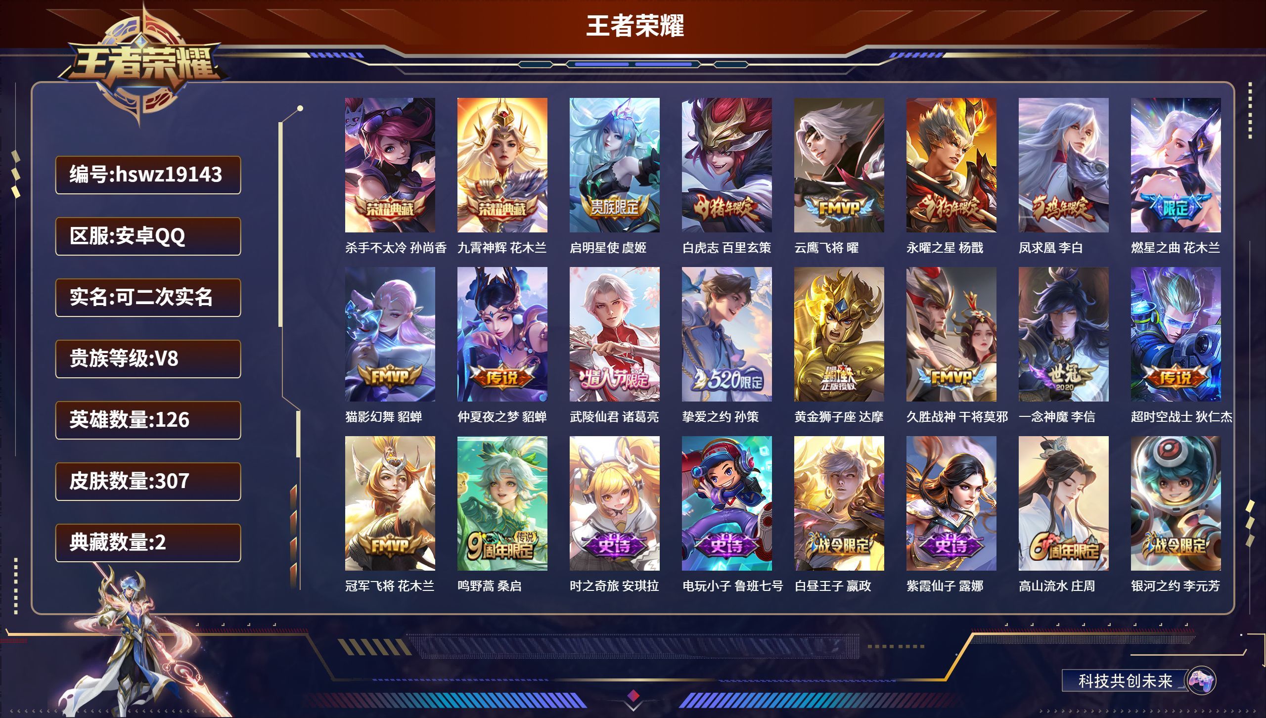 安卓QQ/非凡王者/307皮肤/126英雄/2典藏/0珍品无双/0无双/0珍品传说/16传说/92史