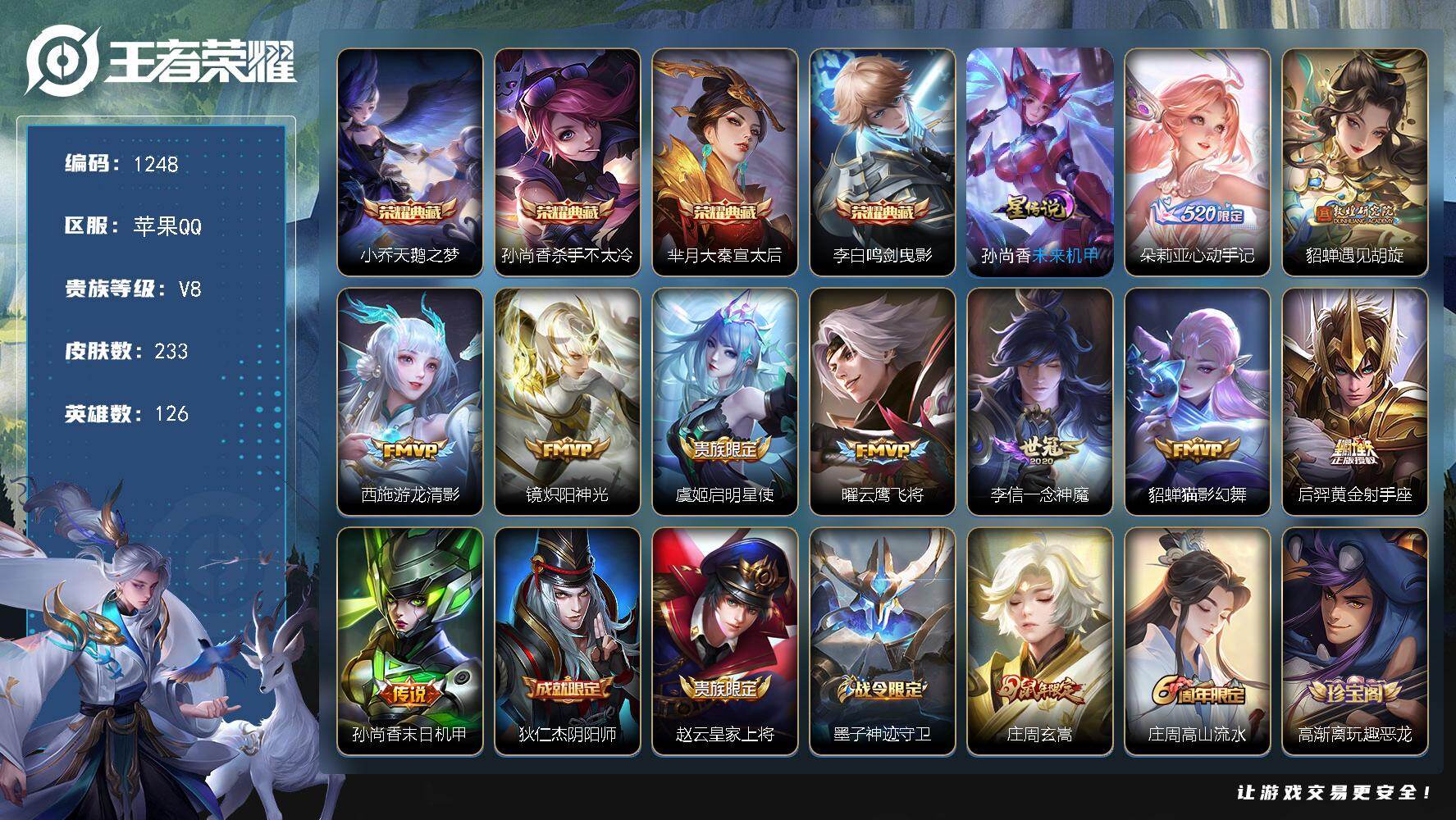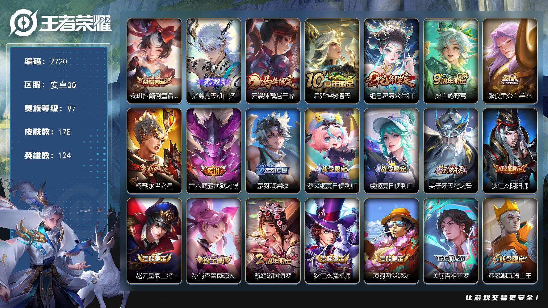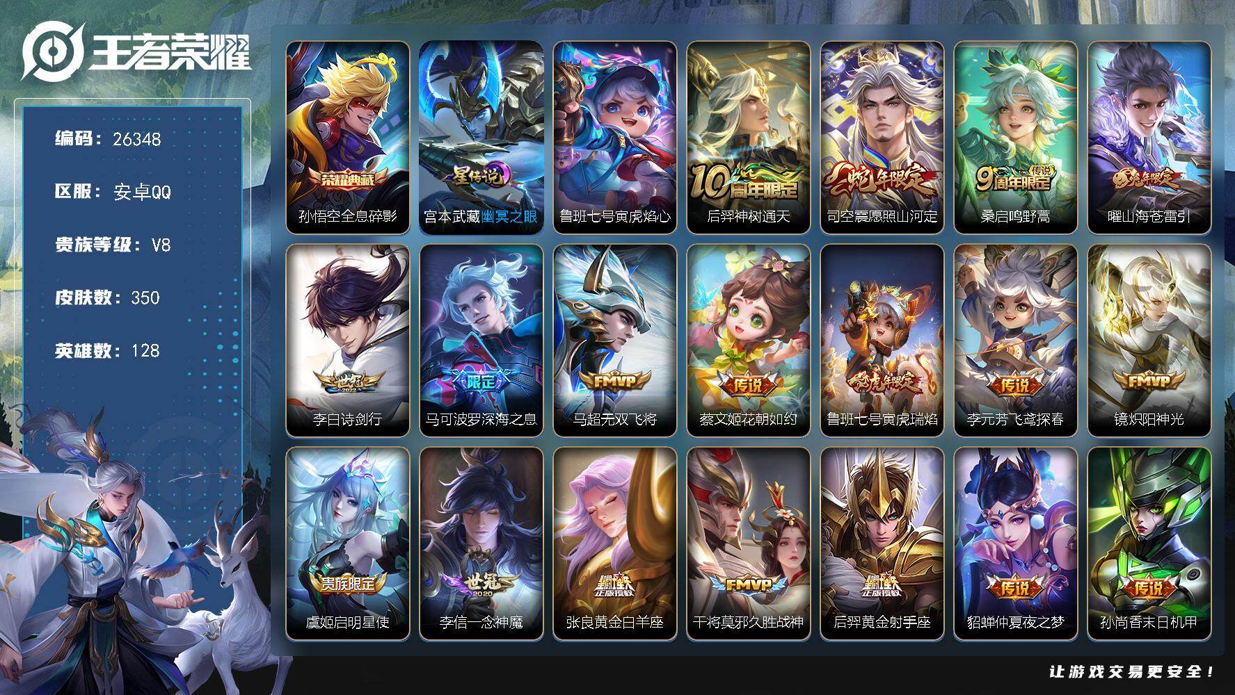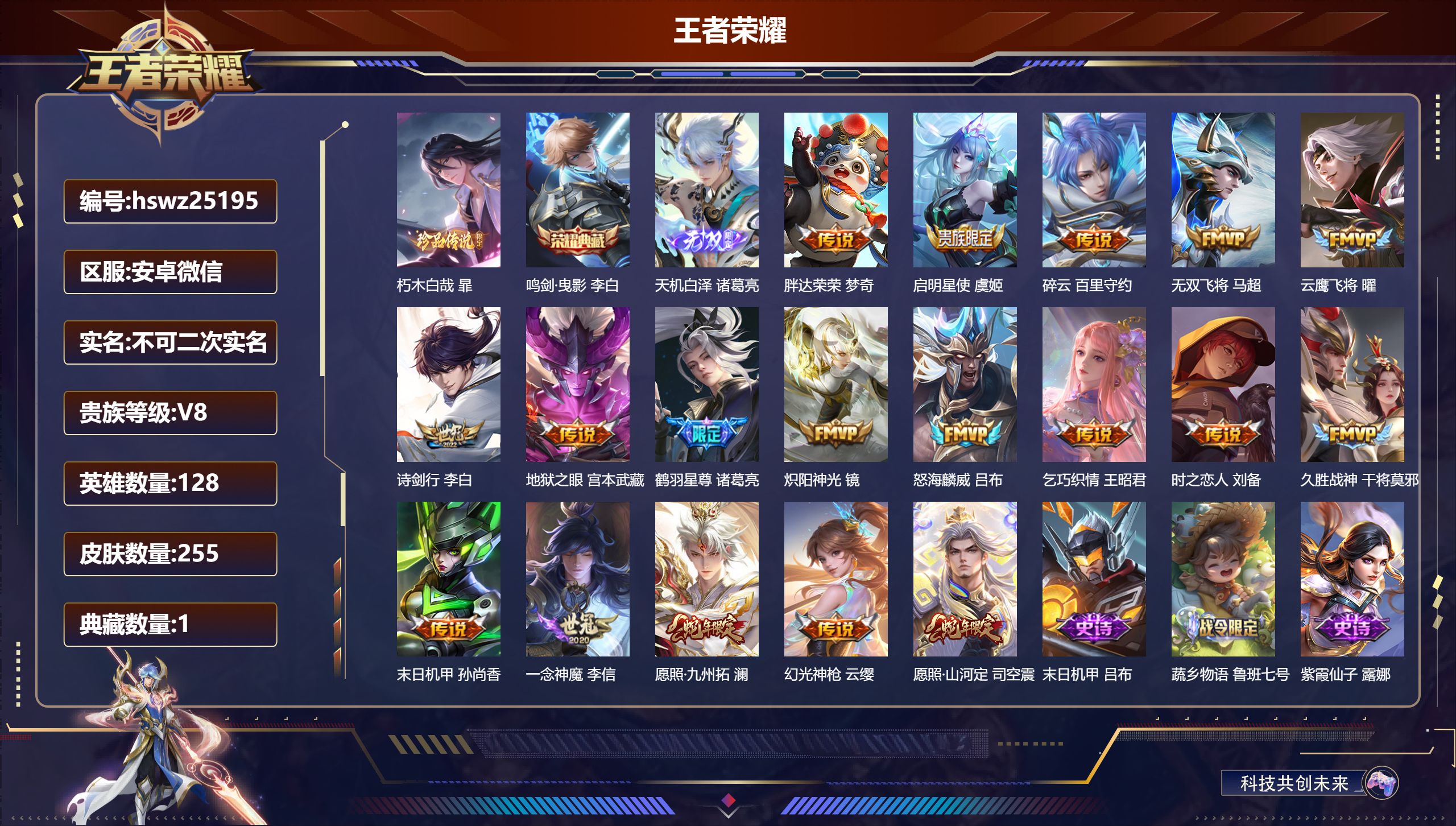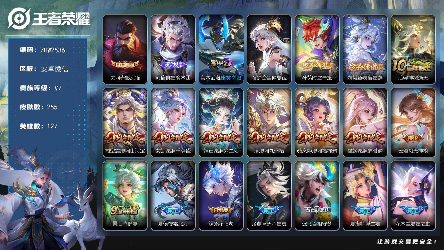 安卓微信/最强王者/255皮肤/128英雄/1典藏/0珍品无双/1无双/1珍品传