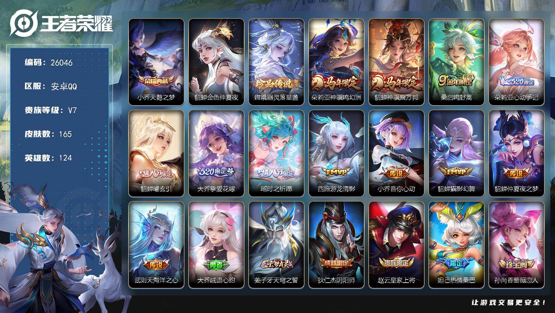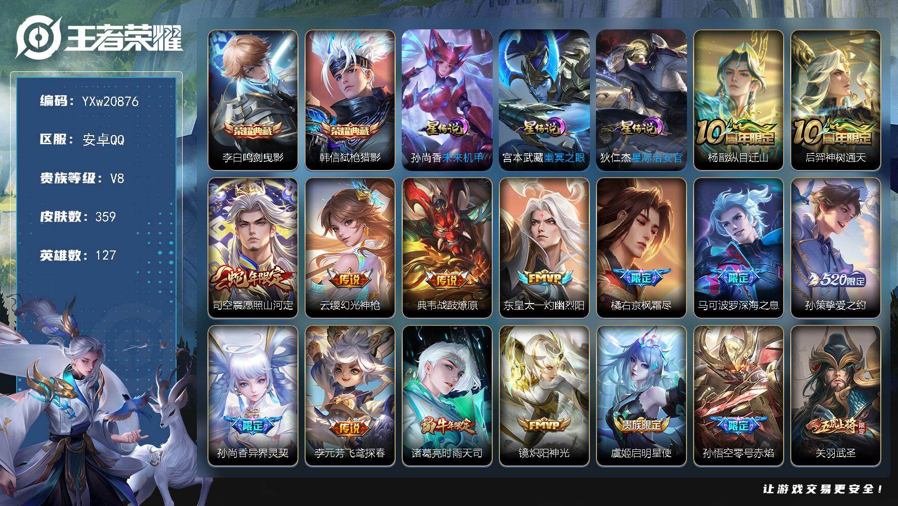 安卓QQ/至尊星耀/264皮肤/127英雄/1典藏/0珍品无双/1无双/1珍品传说/29传说/76史