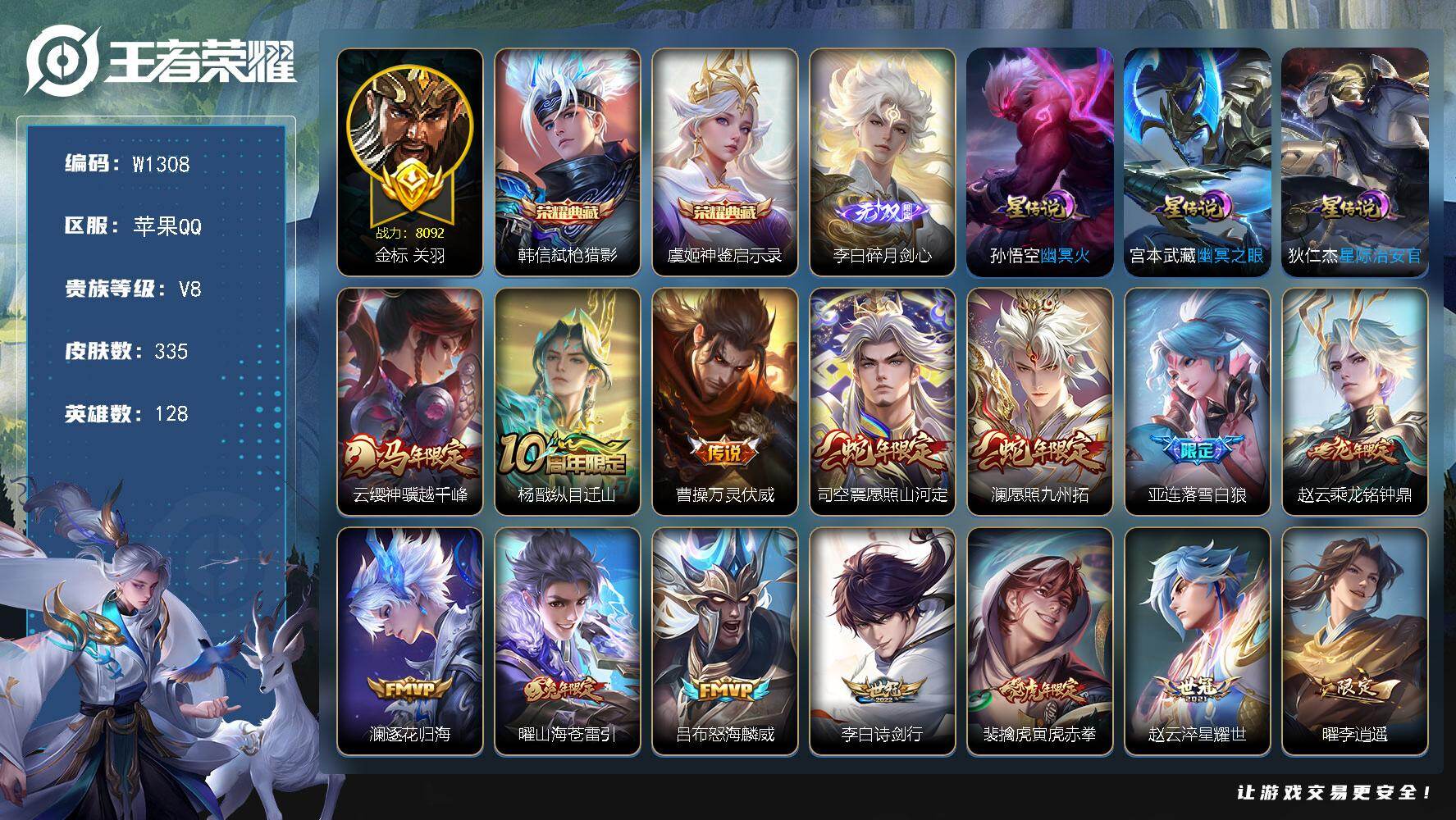 iOS/金标关羽/弑枪猎影/碎月剑心/梅西/335皮肤2典藏1无双21传说【