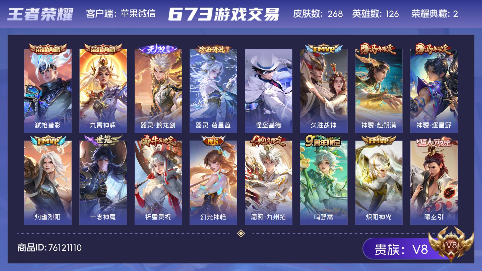 V8 皮肤268 英雄126 最强王者 荣耀典藏2 无双皮肤1 珍品传说2 传说26 其他皮肤244