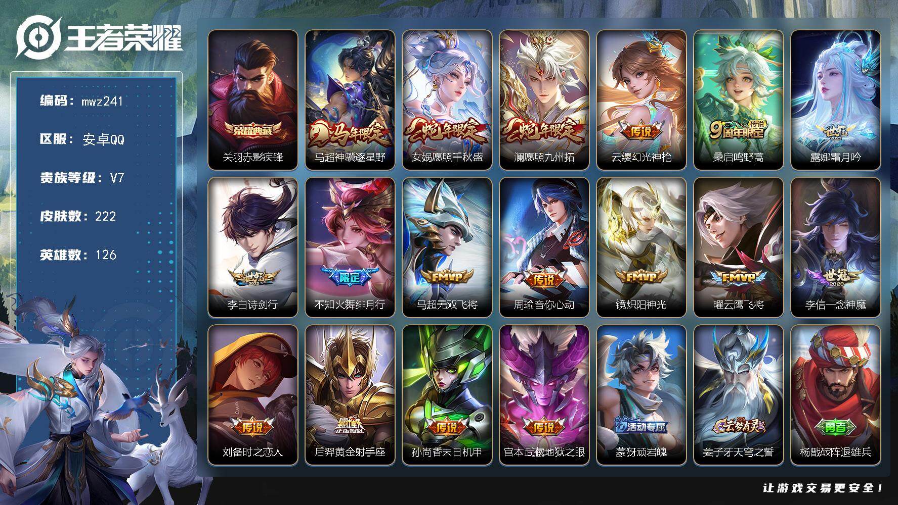 【mwz241】安卓Q-V7-最强王者段位-126英雄-222皮肤-1典藏皮肤