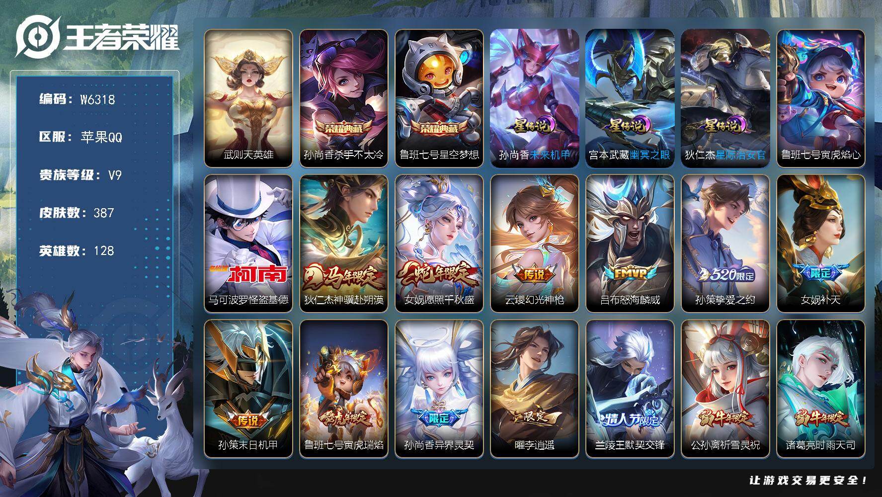 【2无双1珍品1水晶16传说2星元 秒换绑不用等】苹果QQ-109英雄-110皮