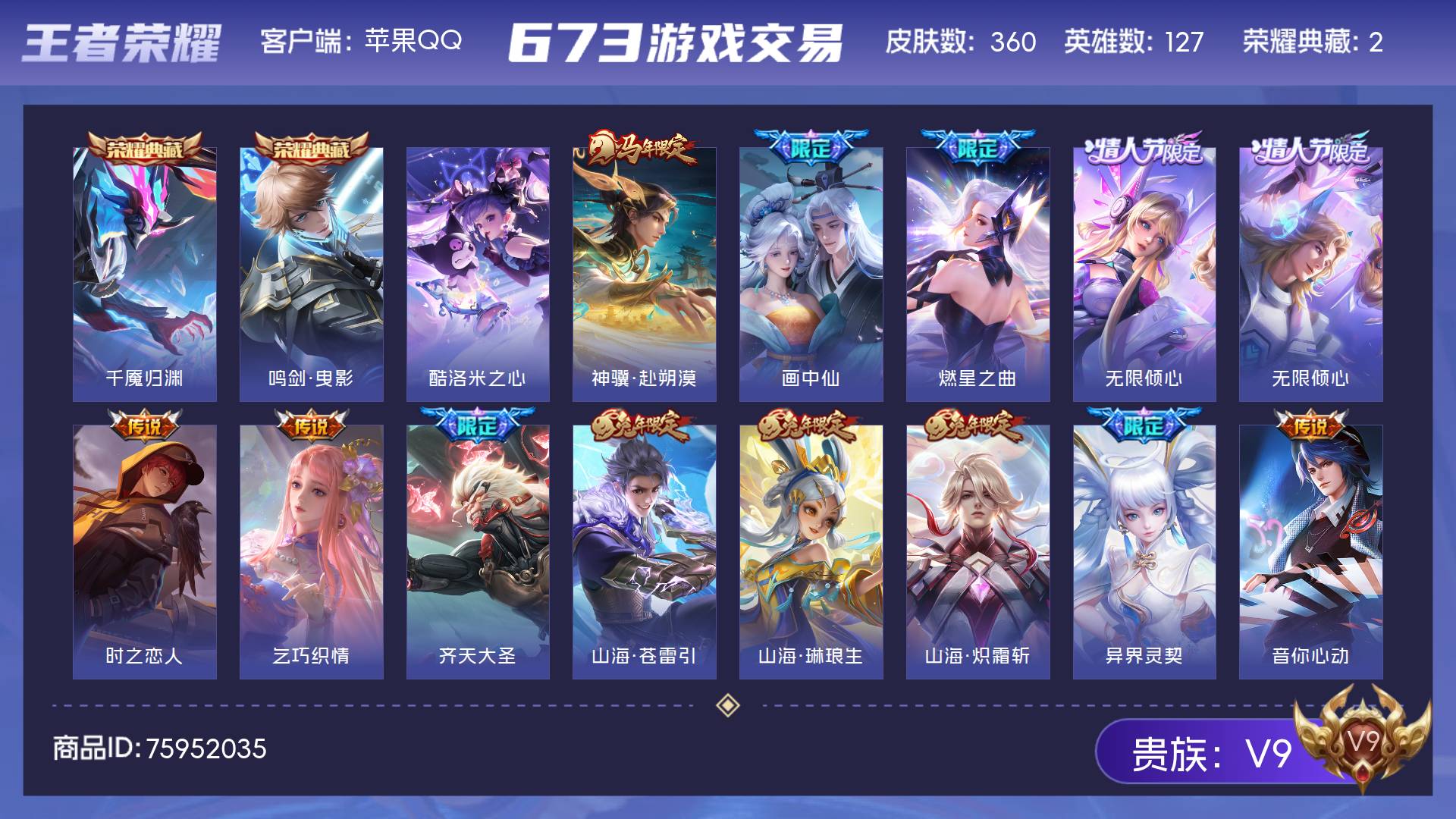 V9 皮肤360 英雄127 至尊星耀 荣耀典藏2 珍品传说1 传说25 其他皮肤338