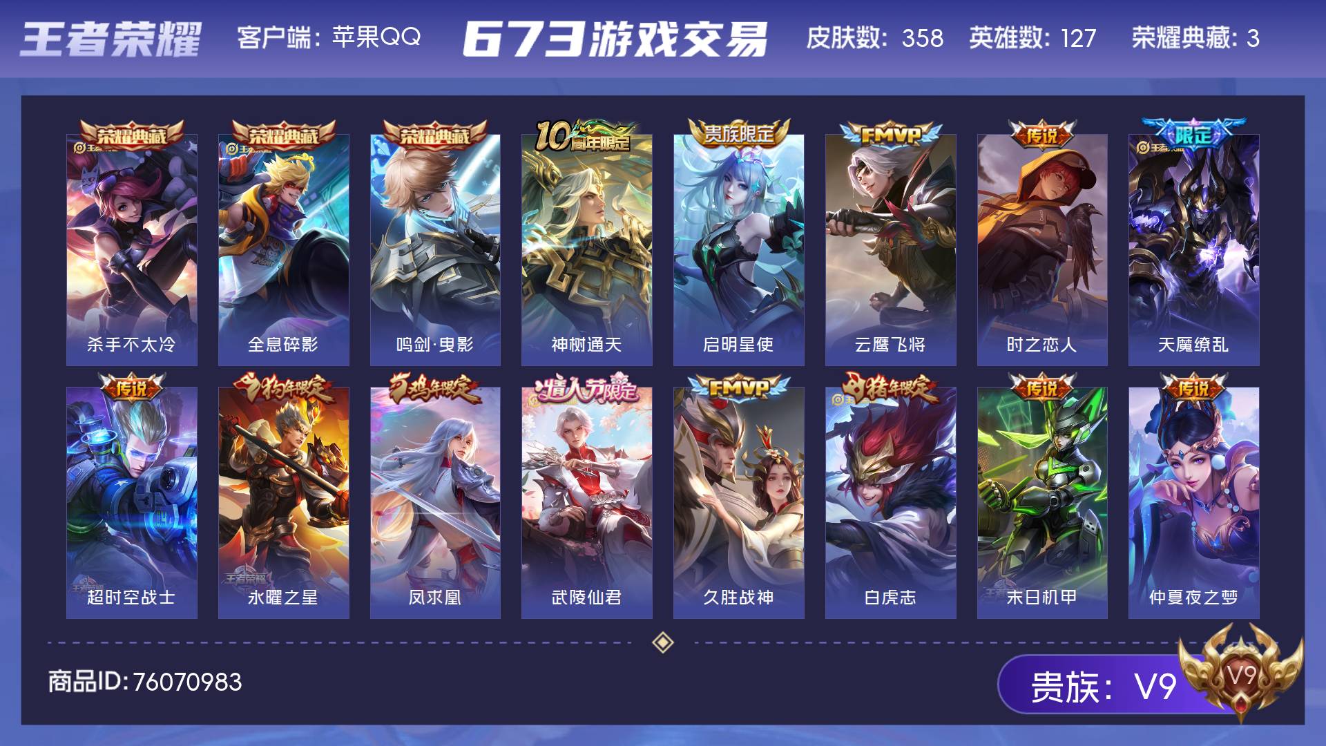 V9 皮肤358 英雄127 至尊星耀 荣耀典藏3 传说20 其他皮肤342