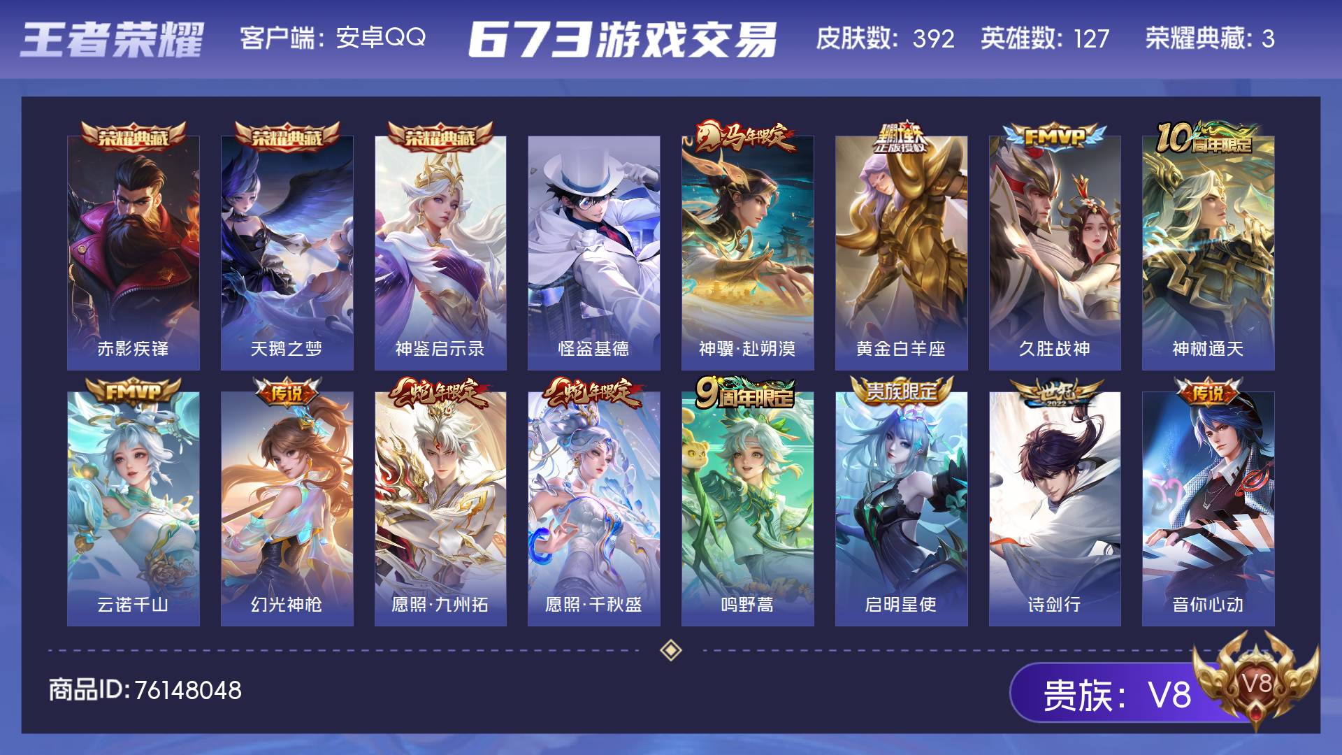 V8 皮肤392 英雄127 非凡王者 荣耀典藏3 珍品传说1 传说17