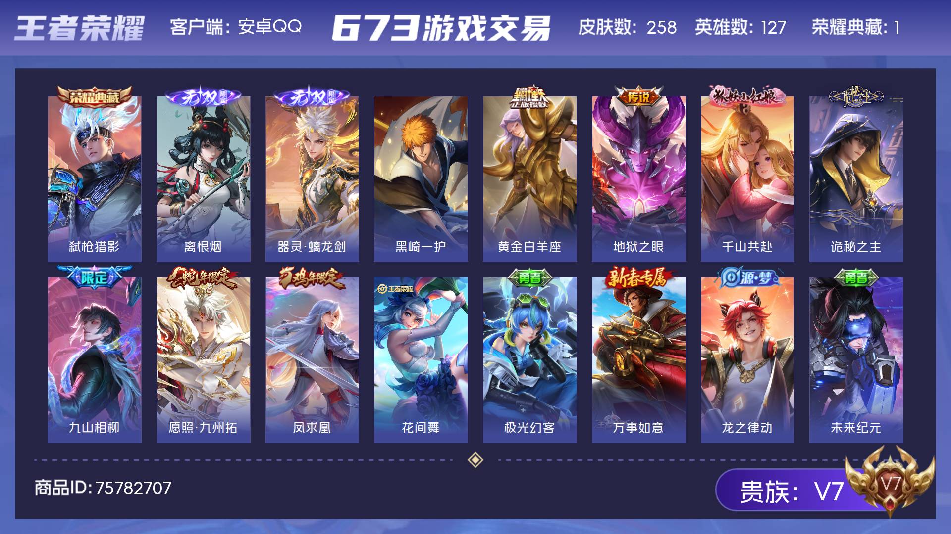 V7 皮肤258 英雄127 至尊星耀 荣耀典藏1 无双皮肤2 珍品传说1 传说8 其他皮肤250