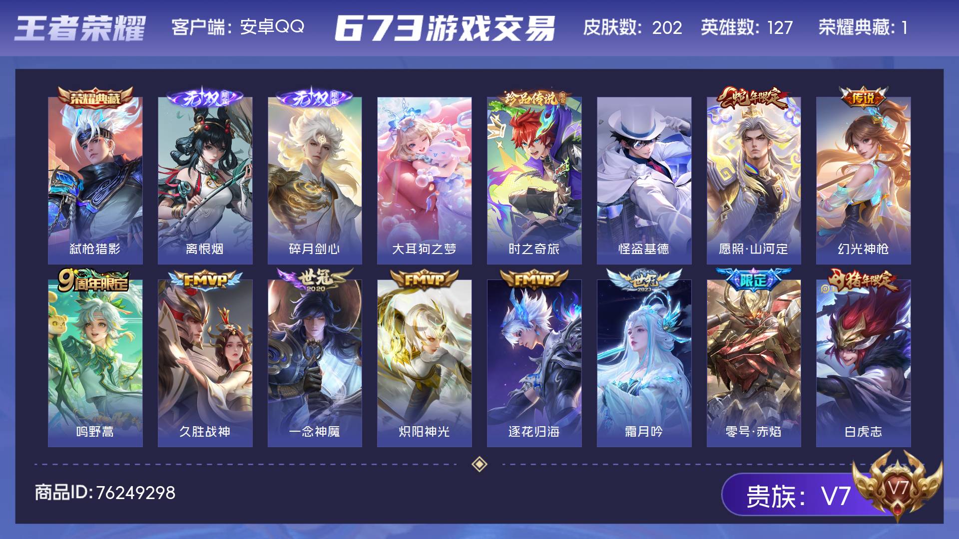 V7 皮肤202 英雄127 至尊星耀 荣耀典藏1 无双皮肤2 珍品传说3 传说10
