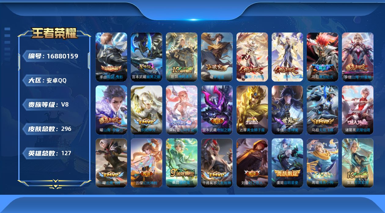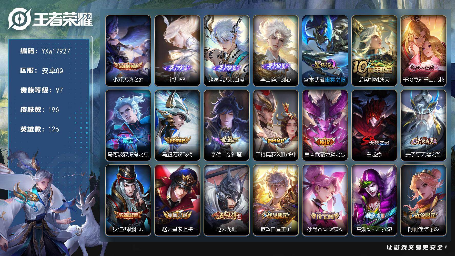 126英雄-196皮肤-10王者印记-150铭文-贵族积分3w