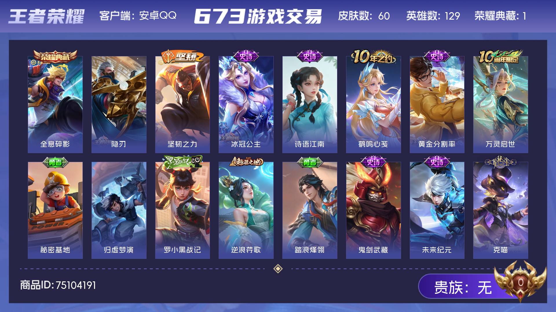 皮肤51 英雄85 永恒钻石 传说1 其他皮肤12-王者原v4账号,退游不玩了,有澜的FMVP,以及各种史诗皮肤,适合拿来当小号,欢迎了解,价格可谈