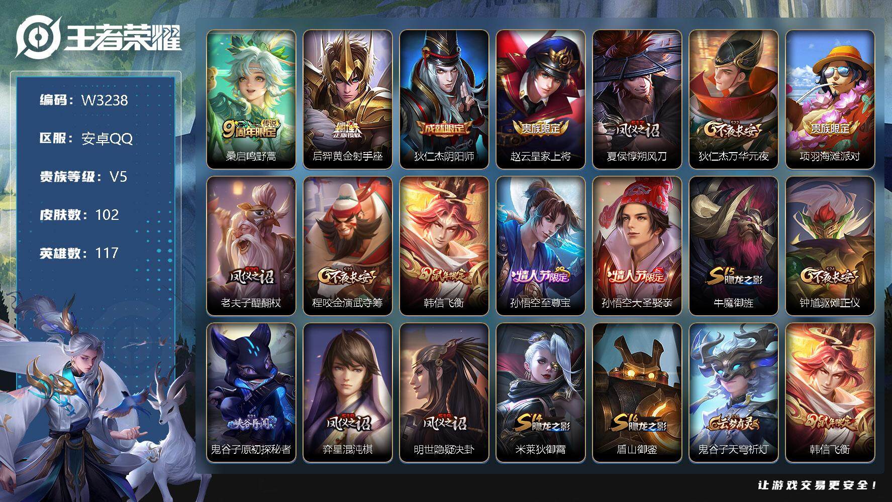 【W3238】孙悟空至尊宝-安卓QQ-无二次-贵5-117英雄-102皮肤-2