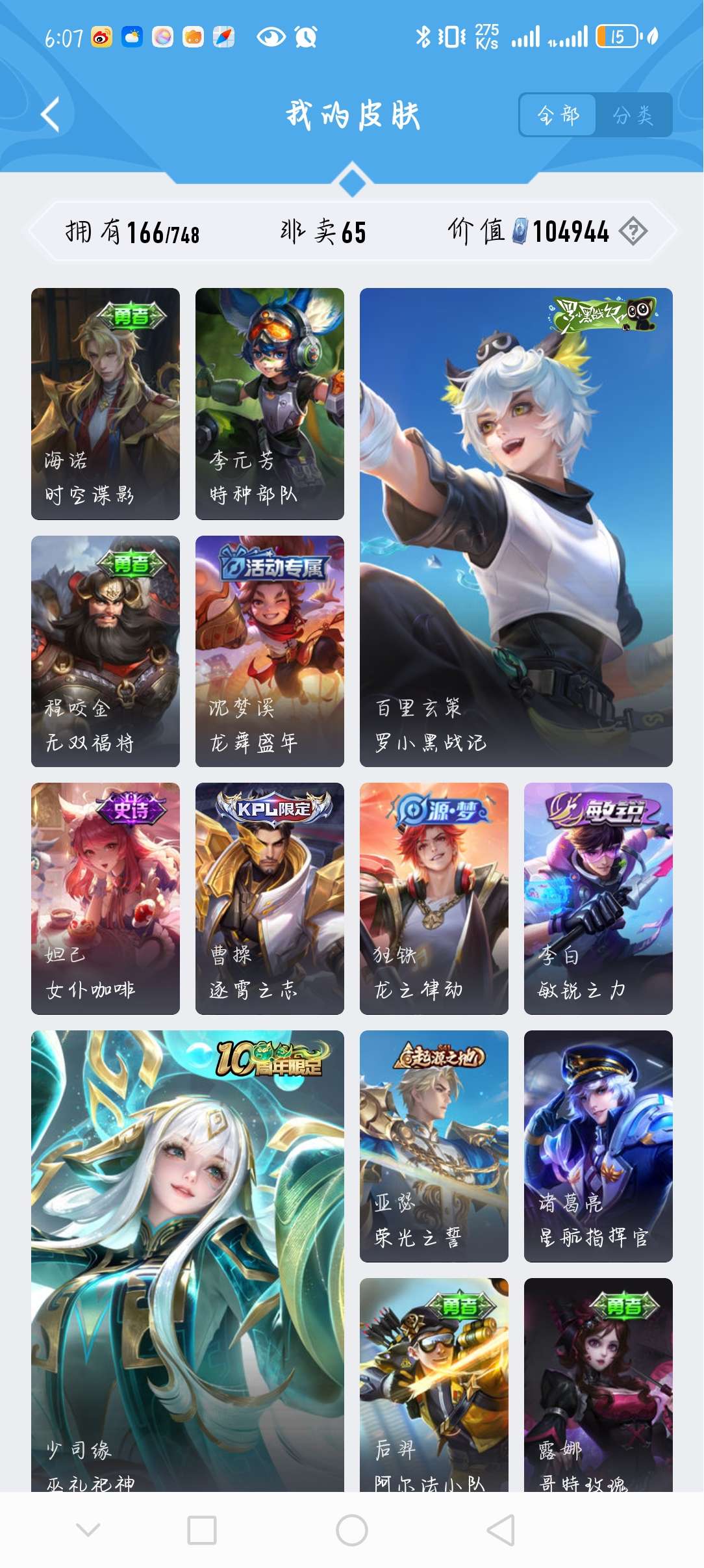 皮肤166 英雄126 永恒钻石 传说5 其他皮肤65-5传说小号,便宜出,不想玩了
