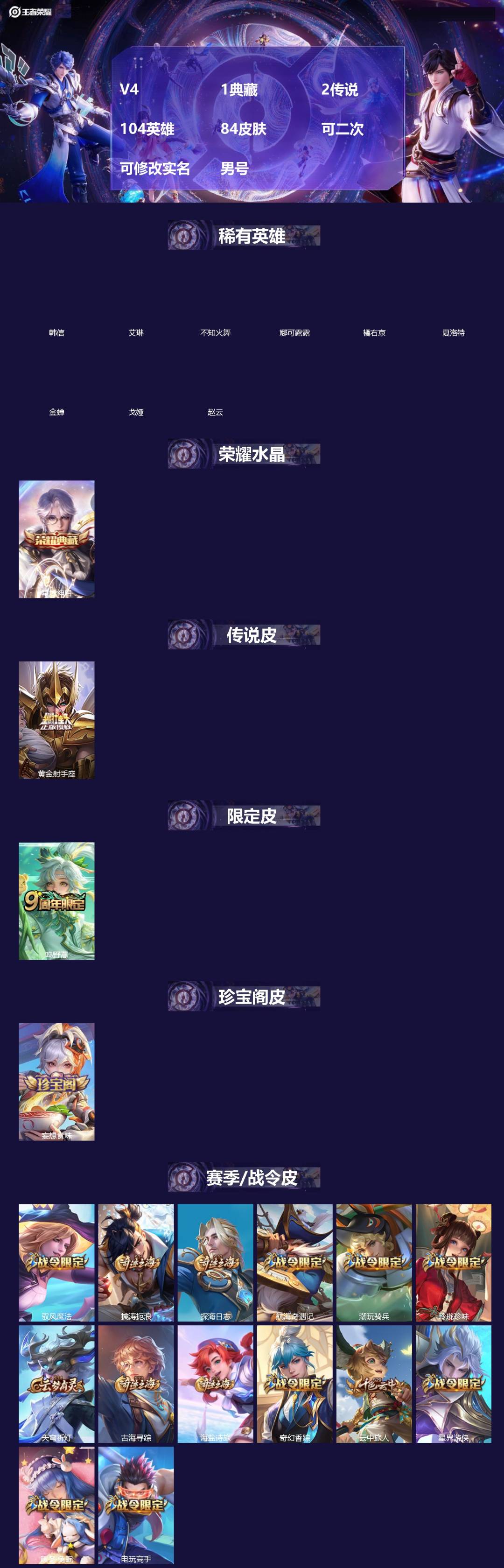 V5 皮肤145 英雄128 荣耀黄金 星传说1 传说4