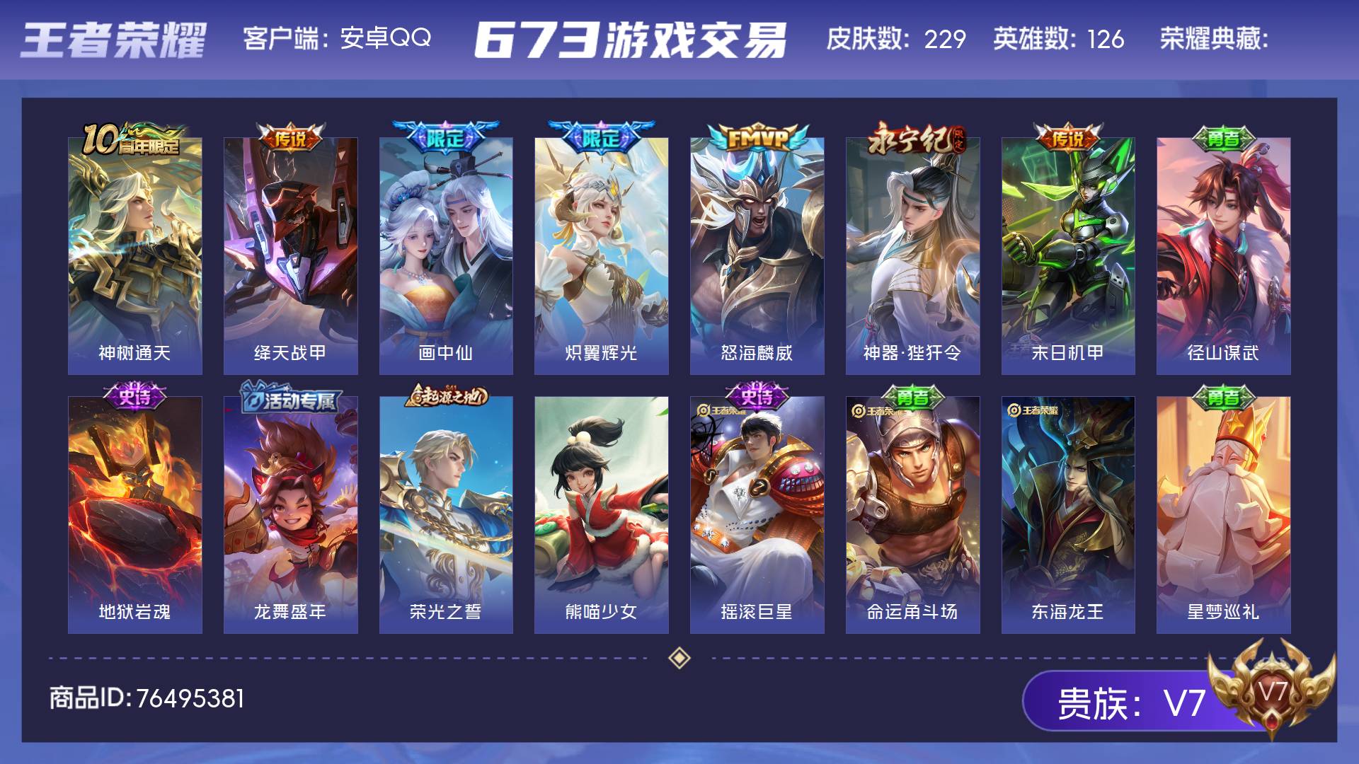 V7 皮肤229 英雄126 至尊星耀 星传说1 传说7