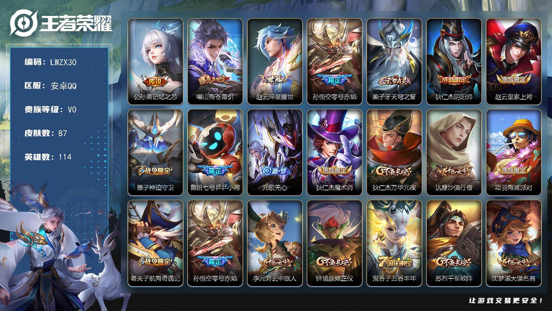可二次【特价出售/店主推荐】安卓Q-V0-永恒钻石I段位-114英雄-87皮肤