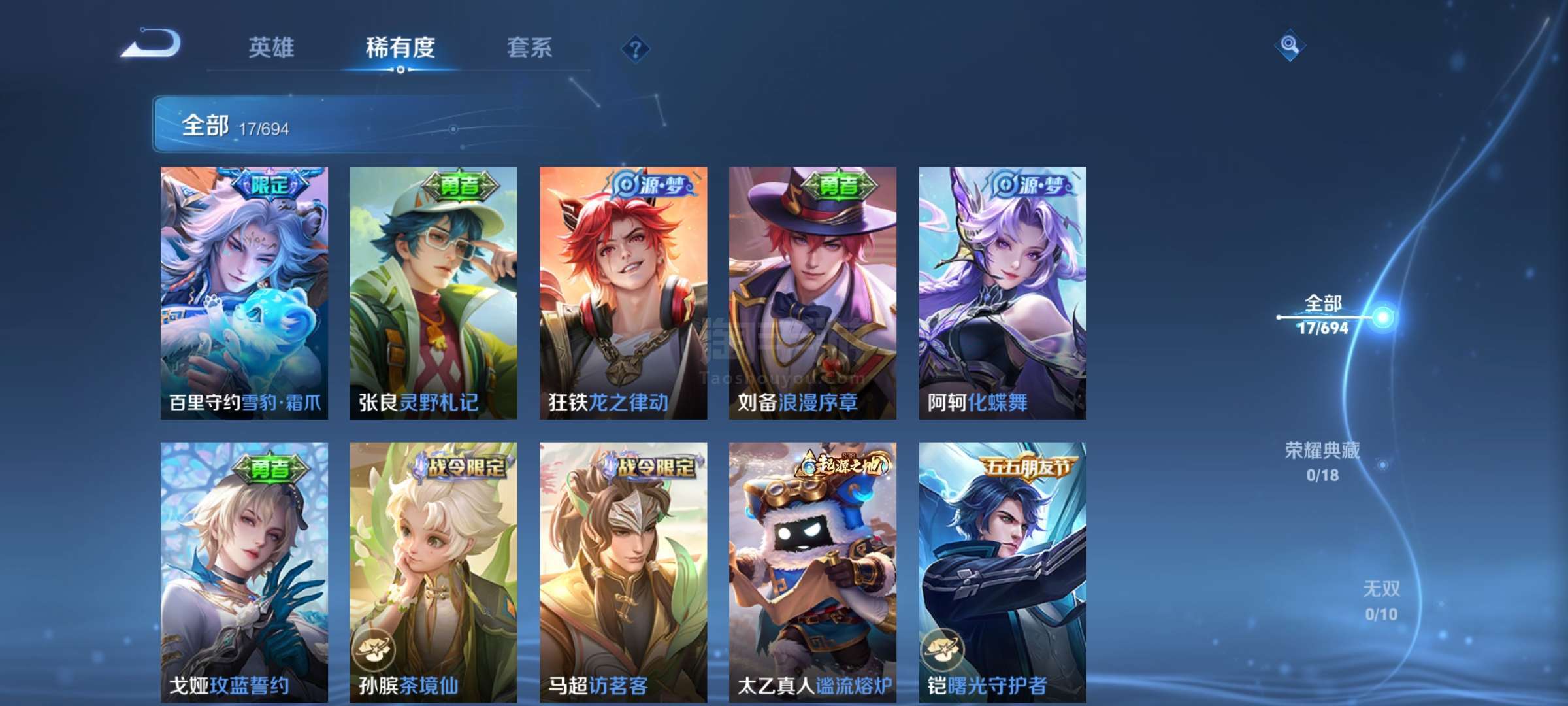 皮肤59 英雄83 荣耀黄金 其他皮肤18-差两颗星双太阳,包赔我出价格可议。