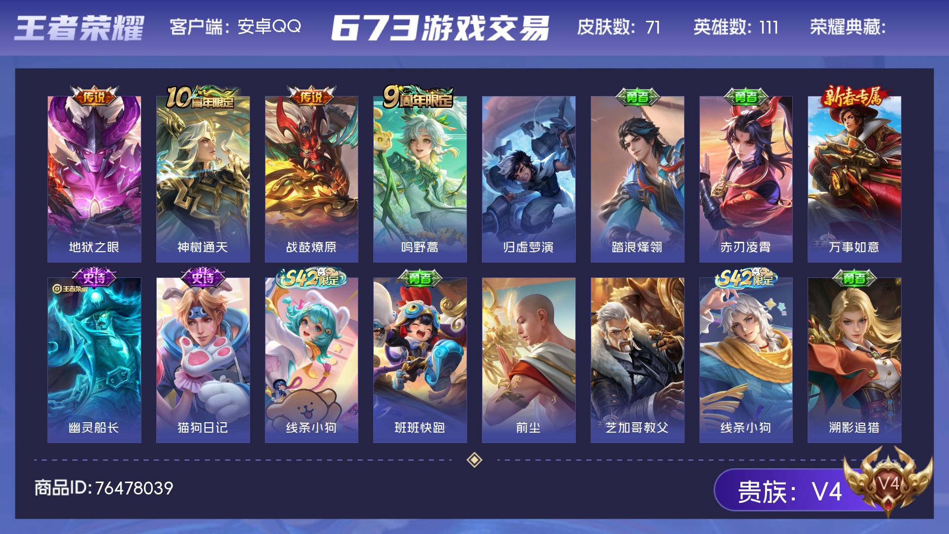 实名: 可修改 贵族等级: V4 英雄数: 109 皮肤数: 70 传说皮: