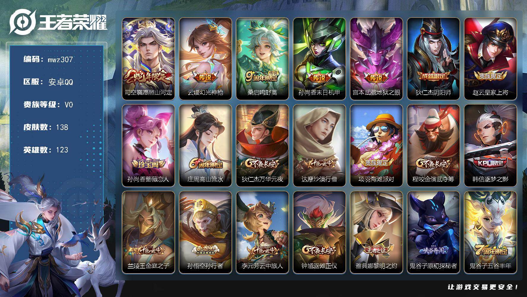 【mwz307】安卓Q-V0-最强王者段位-123英雄-138皮肤-5传说-3