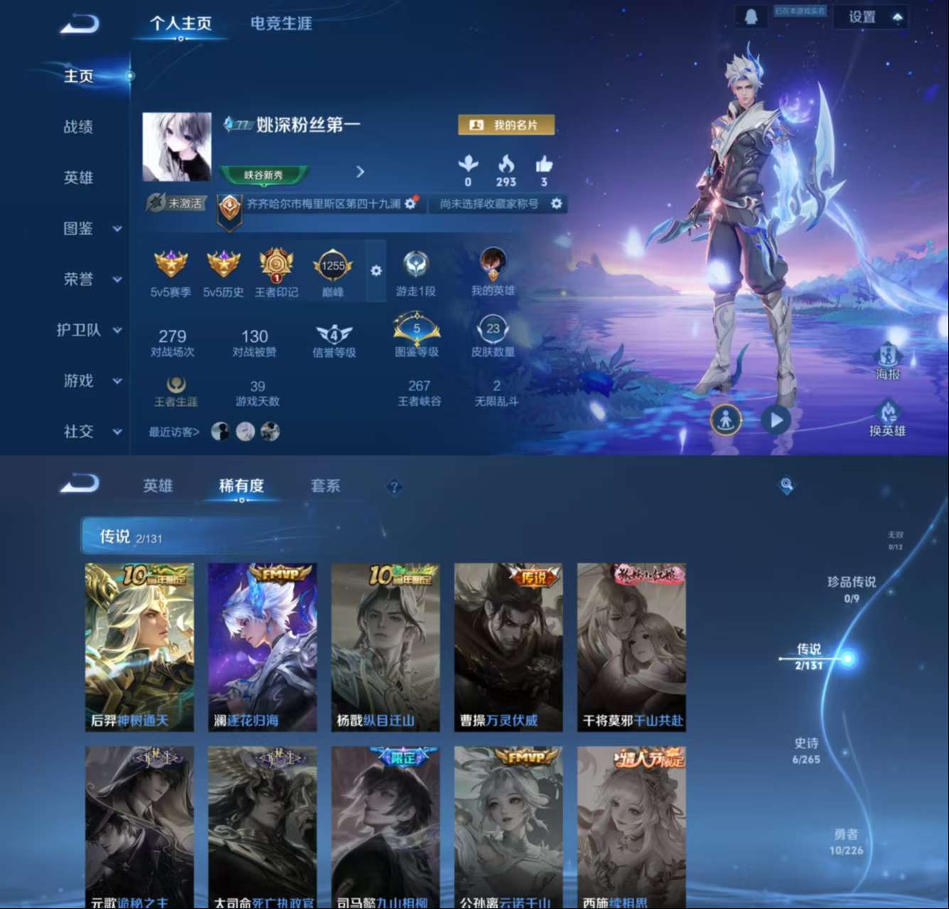 实名: 可修改 贵族等级: V6 英雄数: 111 皮肤数: 105 传说皮: