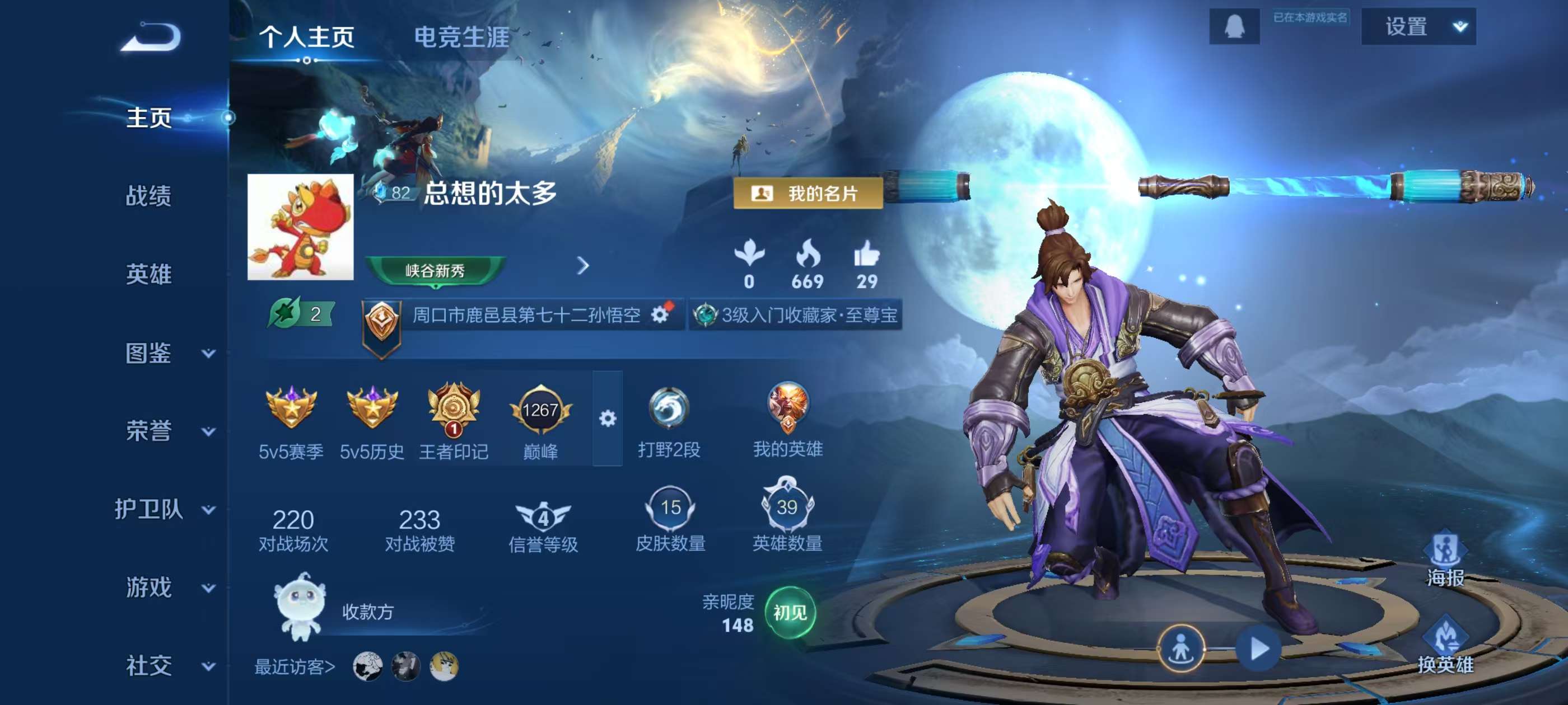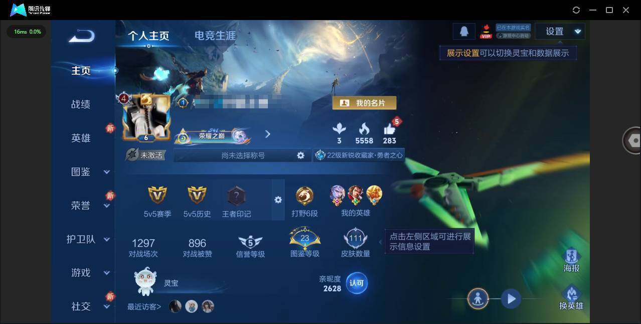 实名: 可修改 贵族等级: V5 英雄数: 116 皮肤数: 91 传说皮: