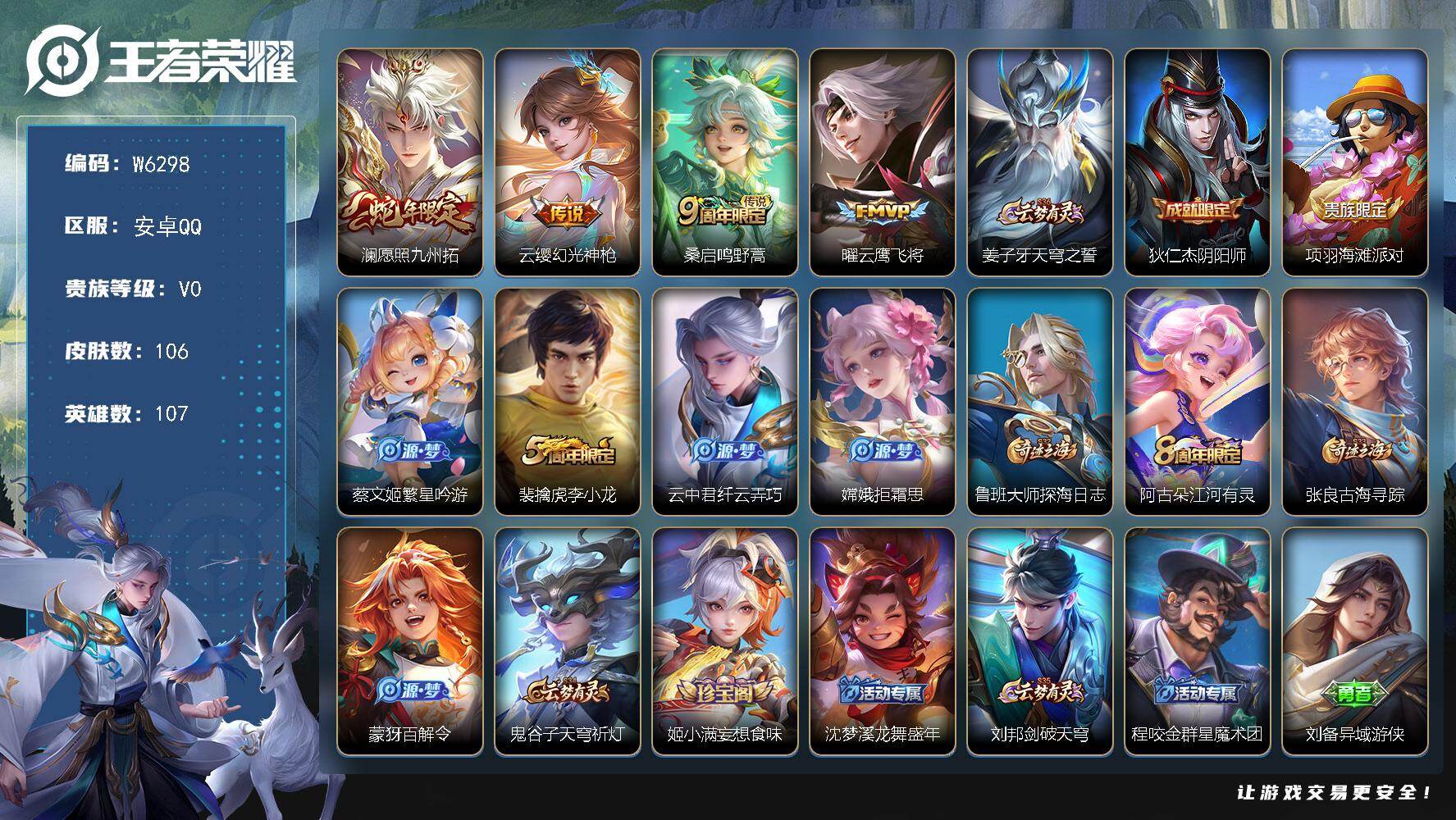 贵族5/皮肤120/传说4/史诗30/英雄122/空空儿全皮/影全皮