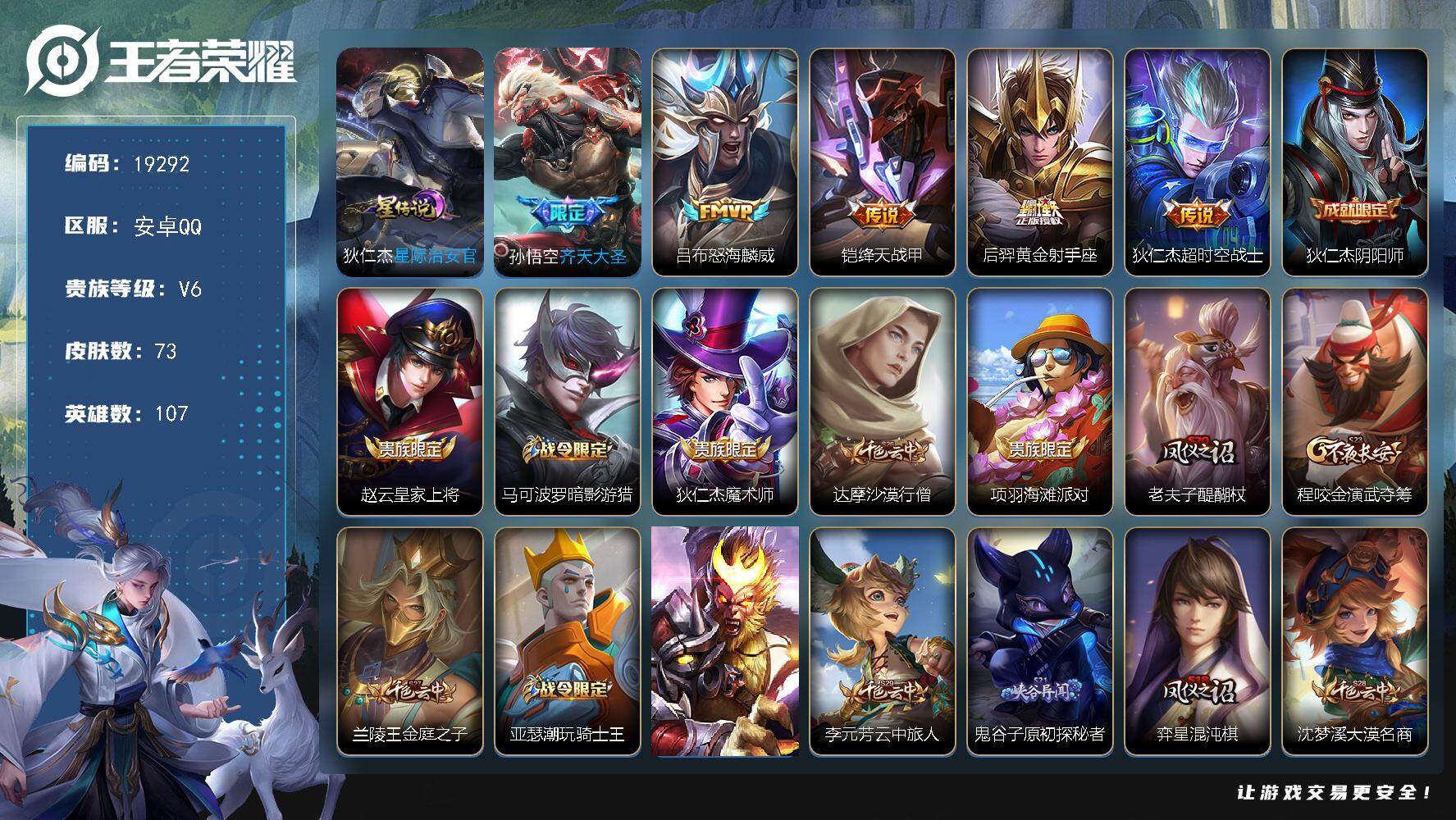 1992672 王者荣耀账号 安卓Q-V3-尊贵铂金IV段位-72英雄-39皮