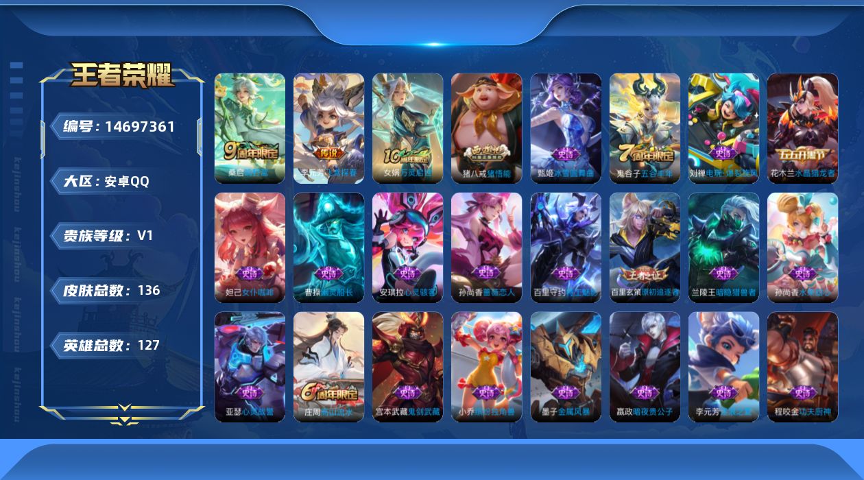 【贵族6 荣耀典藏0 无双0 传说皮肤2 史诗皮肤35 皮肤数量141】当前段位:铂金2 贵族积分:10495 热门皮肤:愿照九州拓