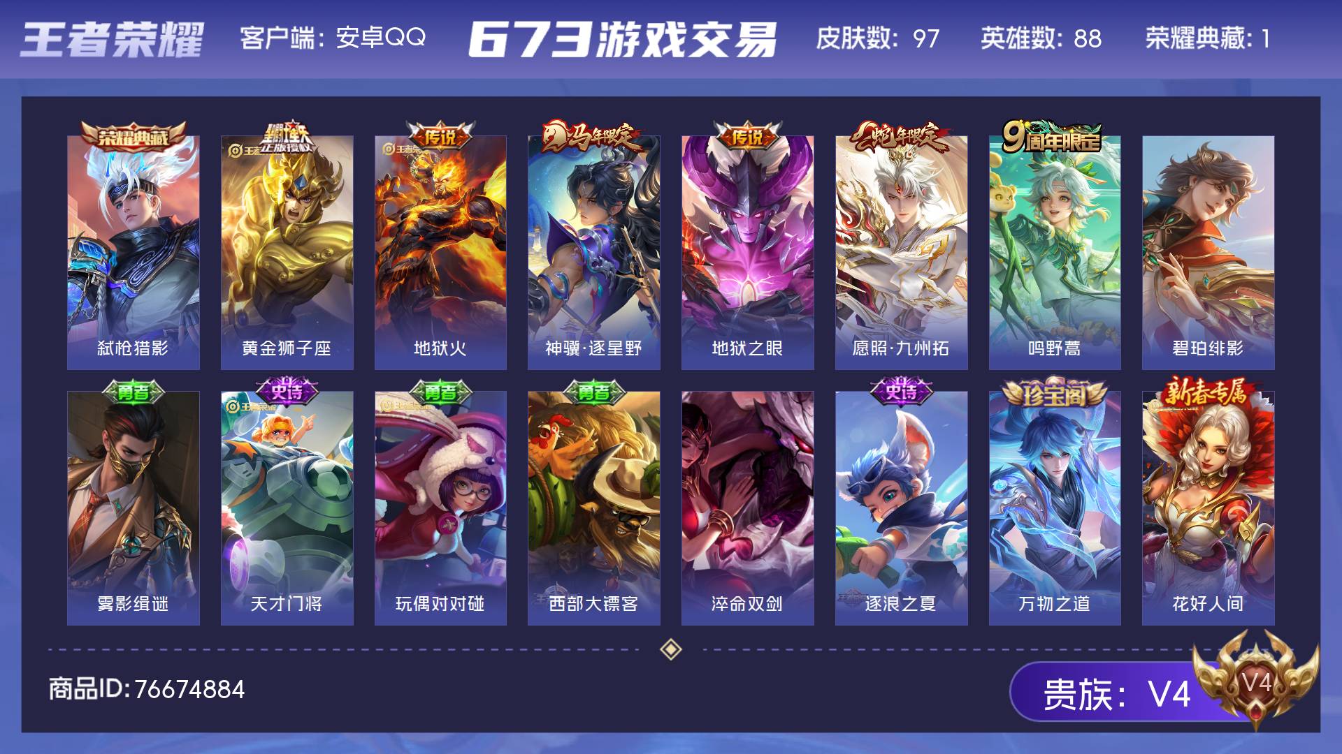 V4 皮肤97 英雄88 至尊星耀 荣耀典藏1 星传说1 传说6