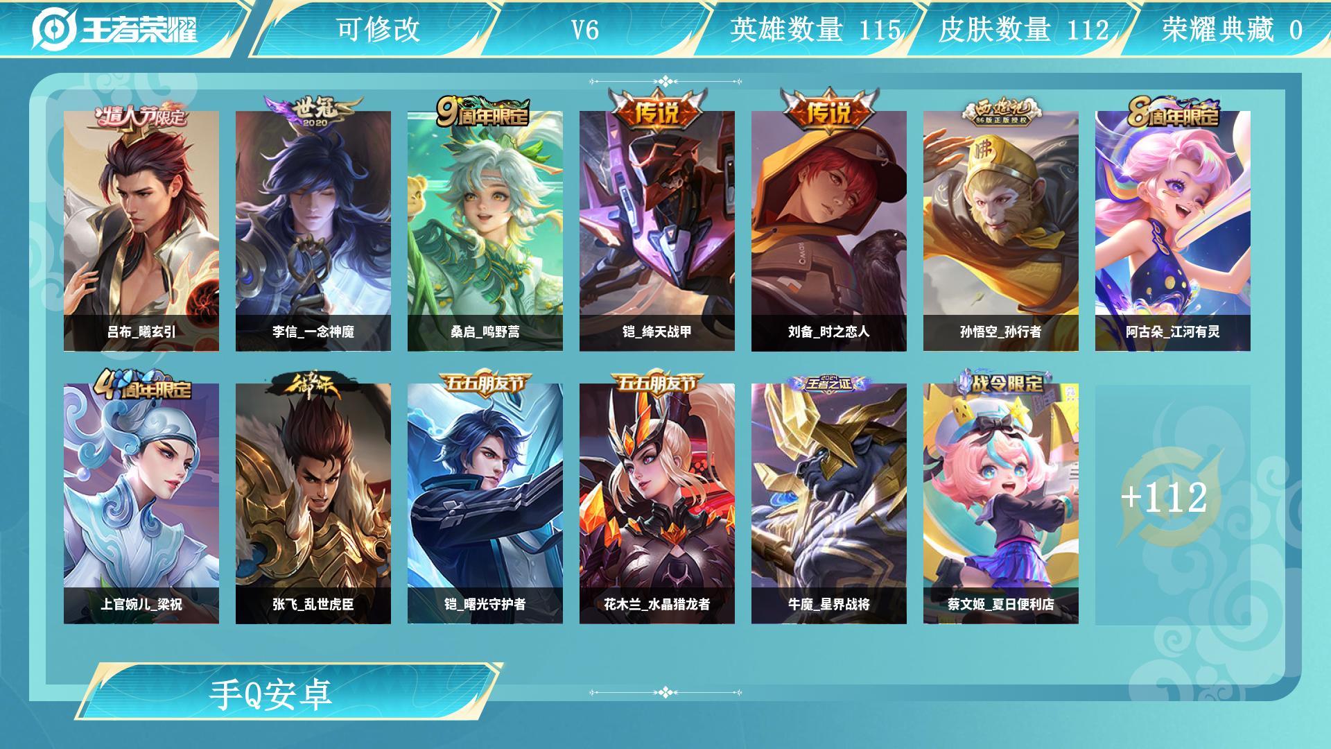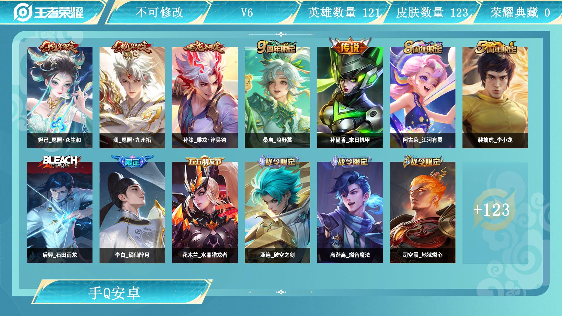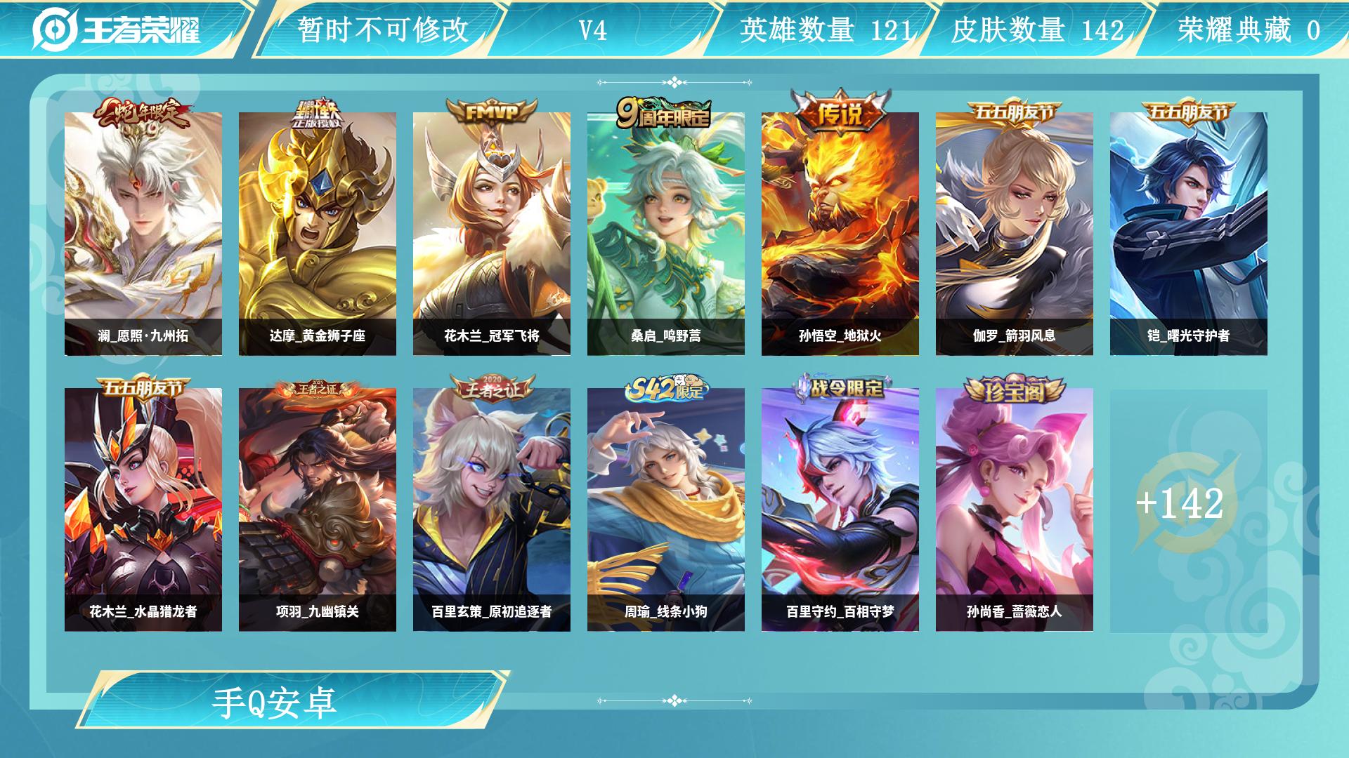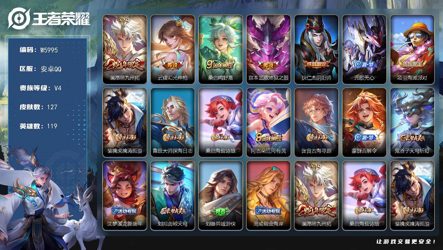 【W5995】安卓Q区-可二次-贵4-119英雄-127皮肤-4传说-26史诗