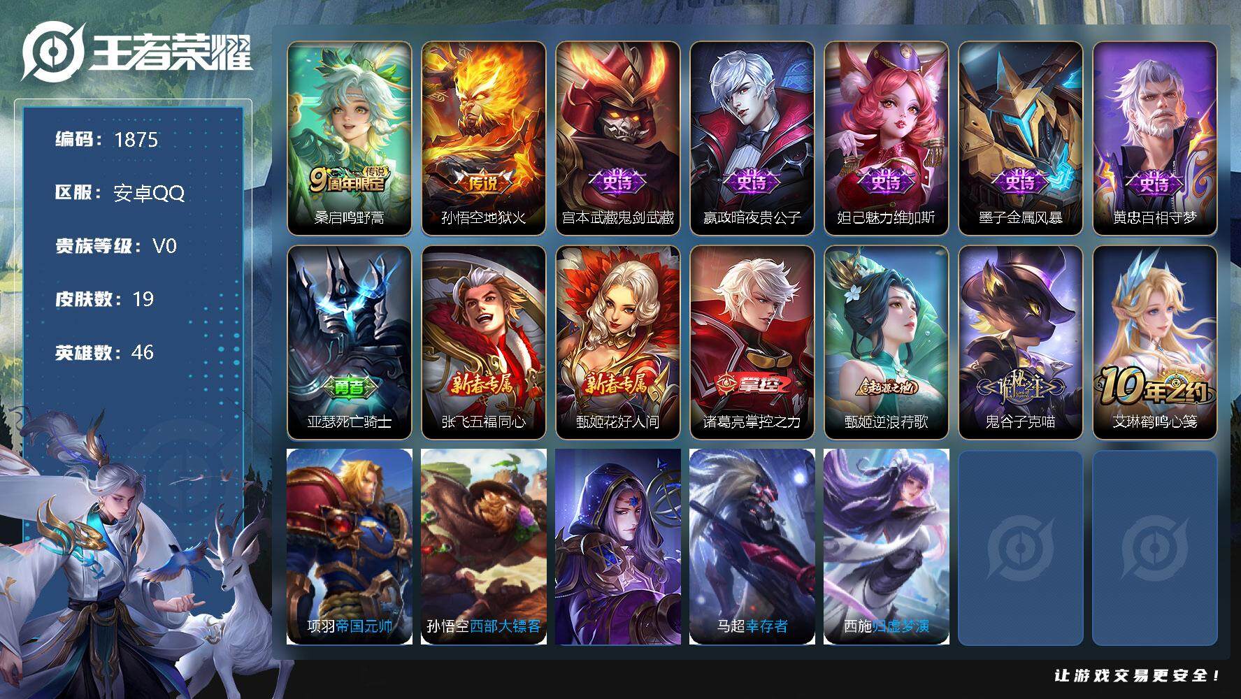 安卓Q-V0-永恒钻石IV段位-46英雄-19皮肤-2传说-5史诗【传说皮肤