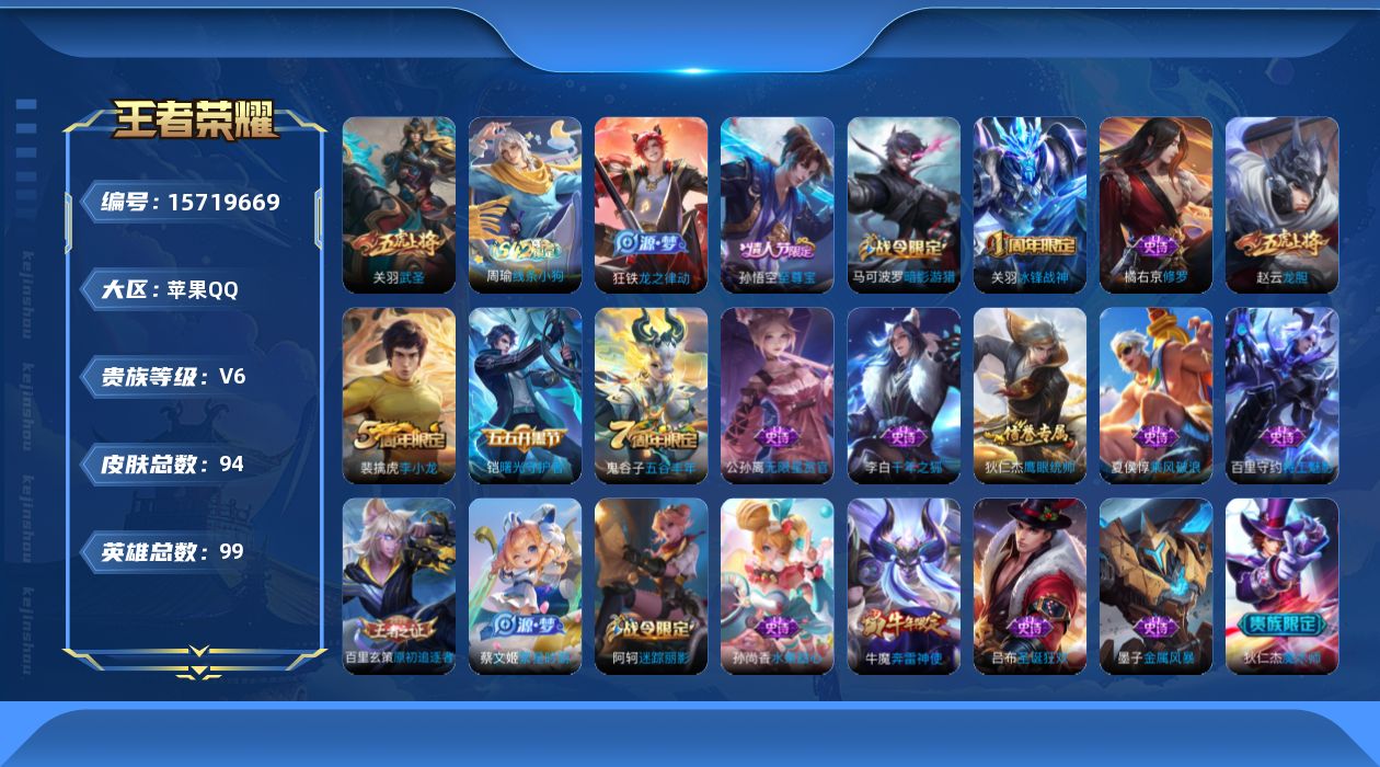 实名: 可修改 贵族等级: V6 英雄数: 120 皮肤数: 94 星传说: