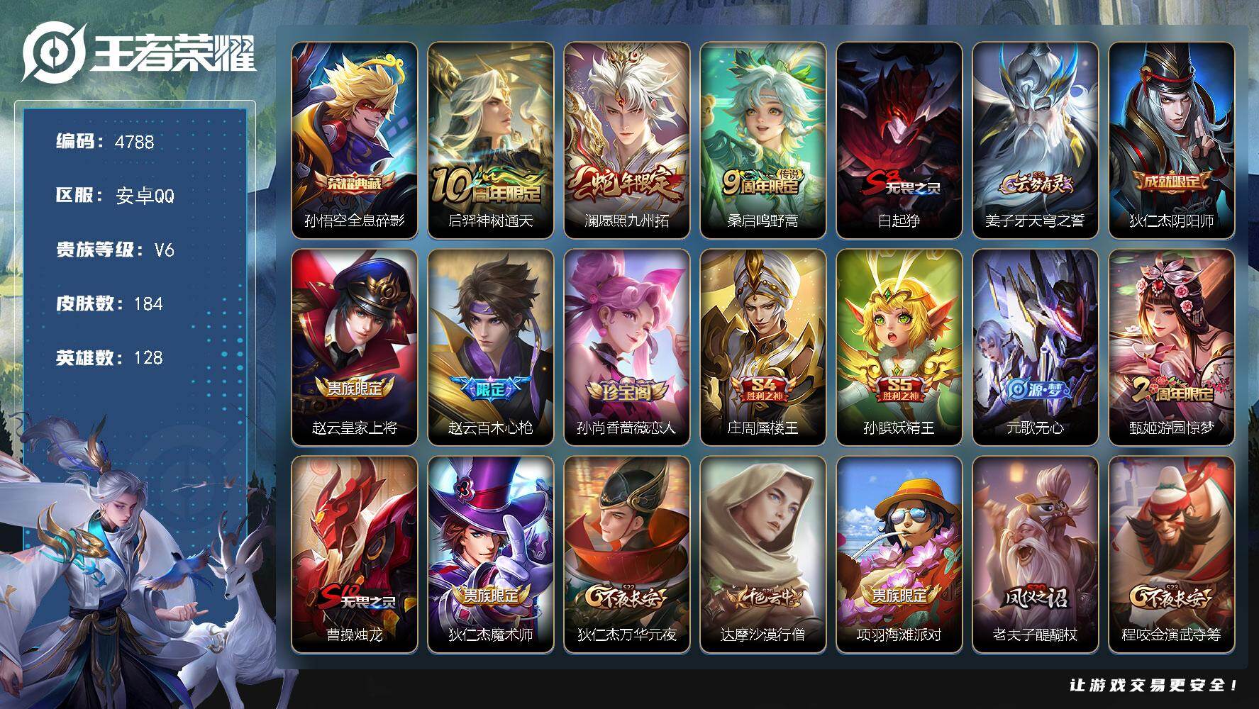 df安卓Q-V6【野王账号,澜年限】128英雄-184皮肤-1典藏皮肤-3传说