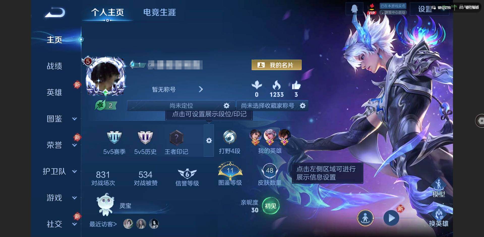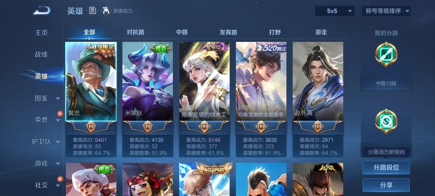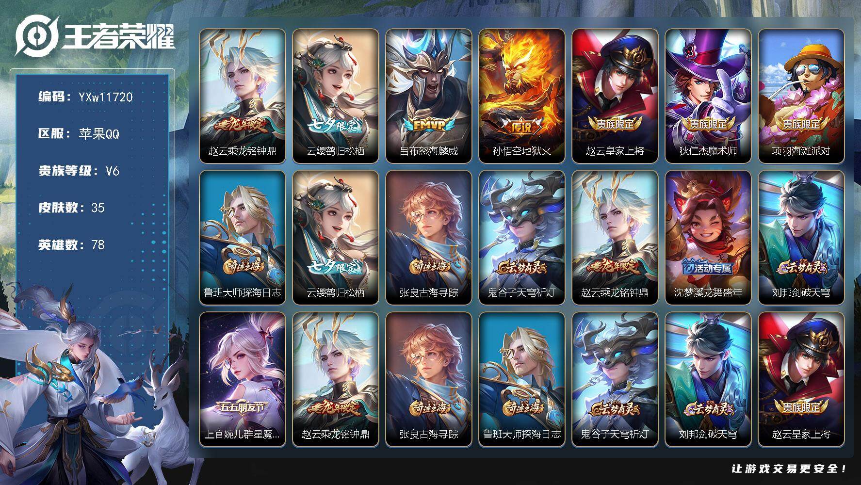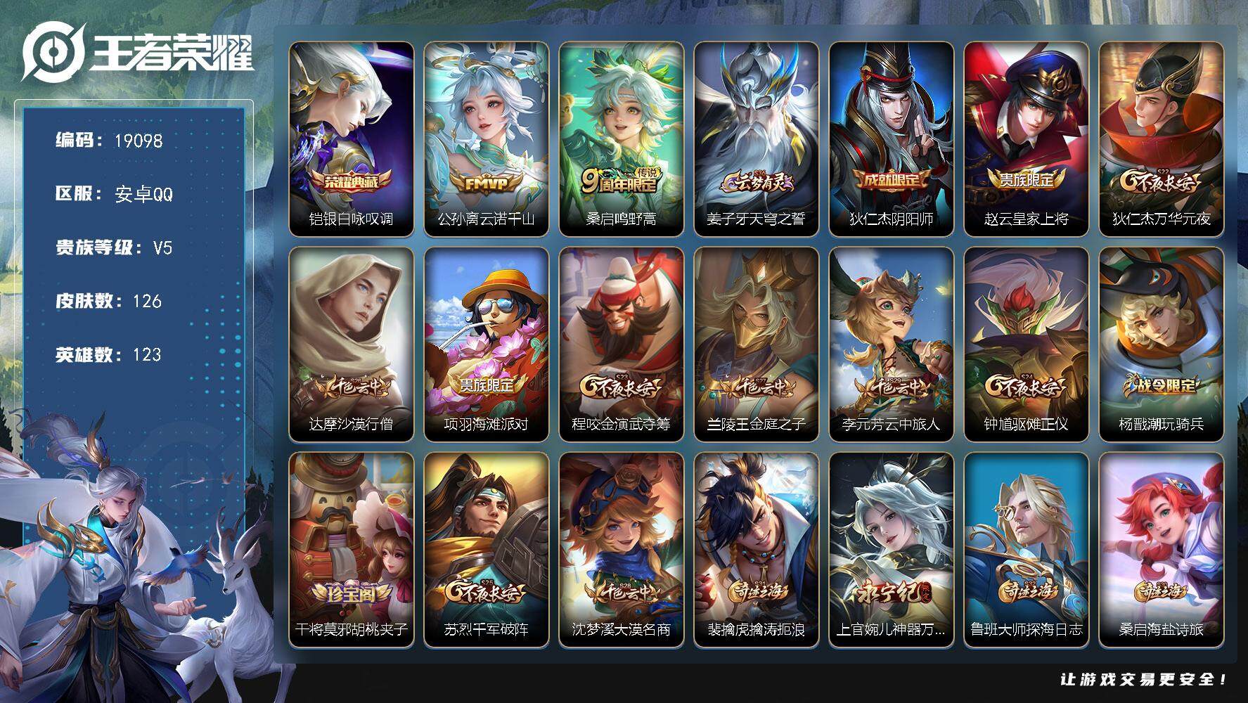 实名: 可修改 贵族等级: V5 英雄数: 85 皮肤数: 48 传说皮: 云