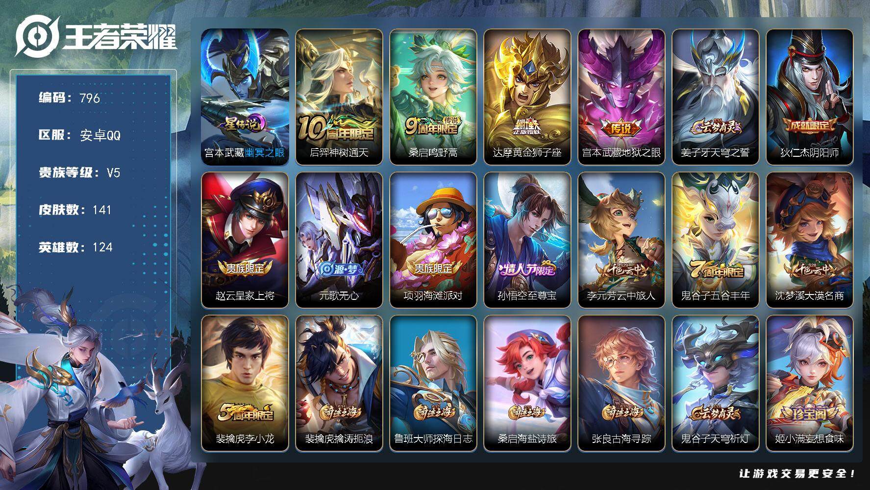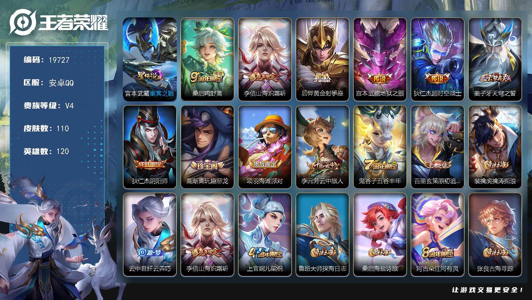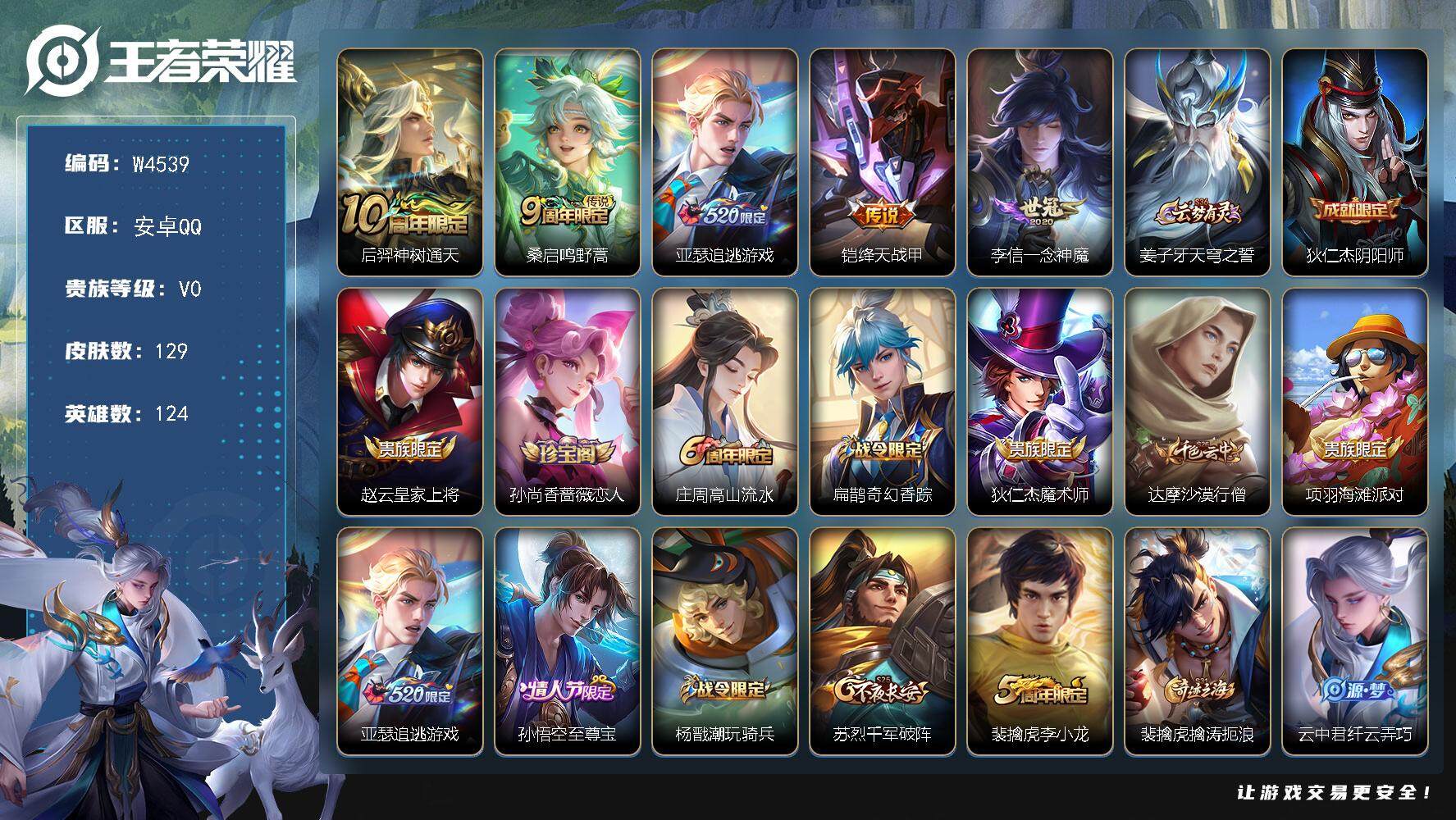 【W4539】安卓QQ-有二次-贵6-124英雄-129皮肤-5传说-36限定
