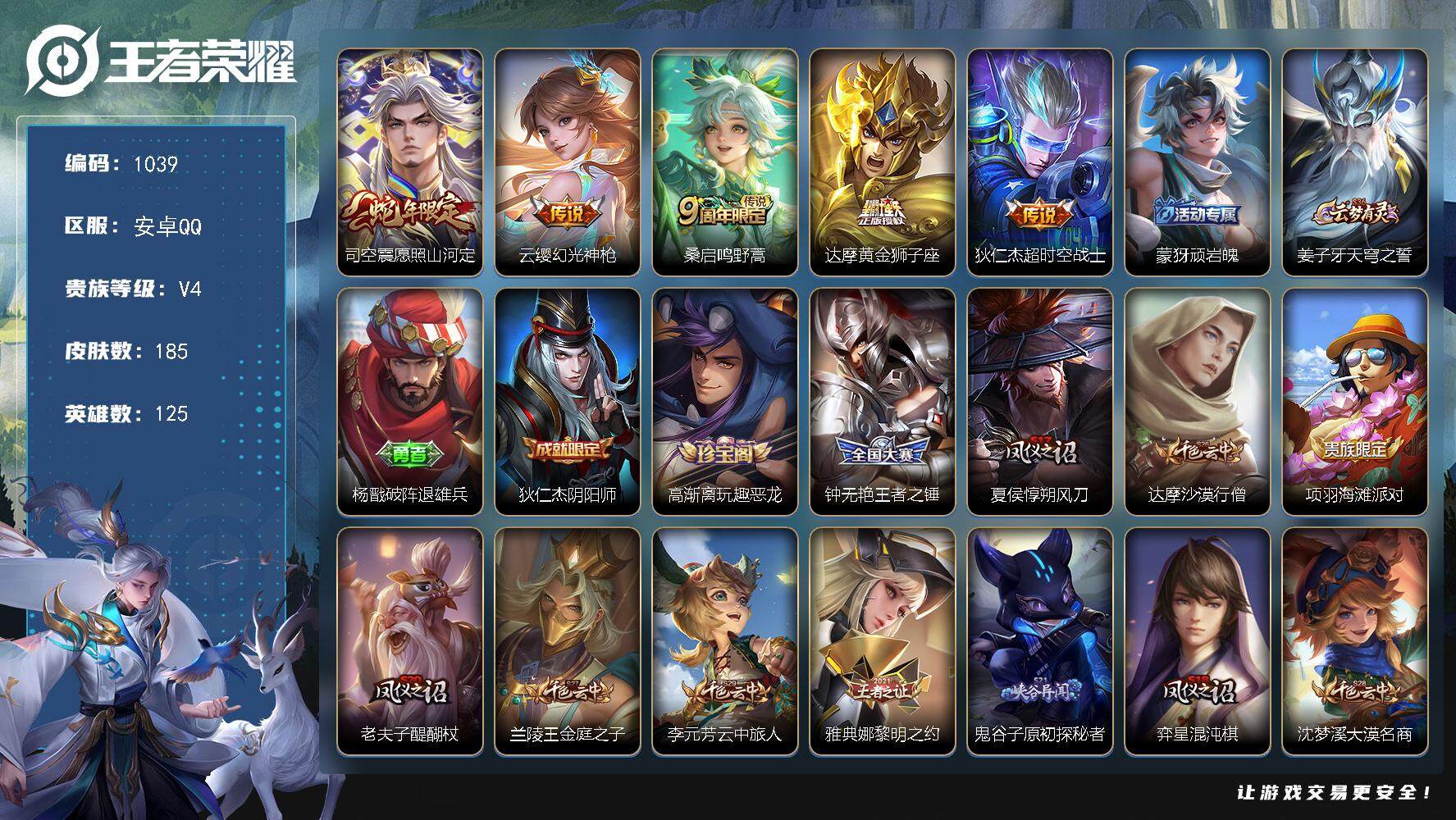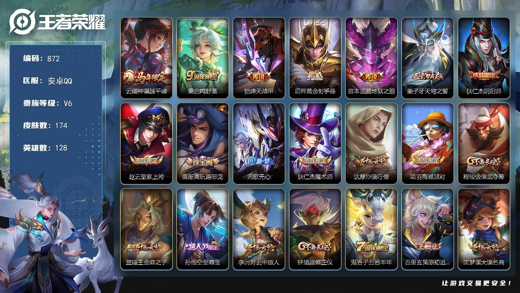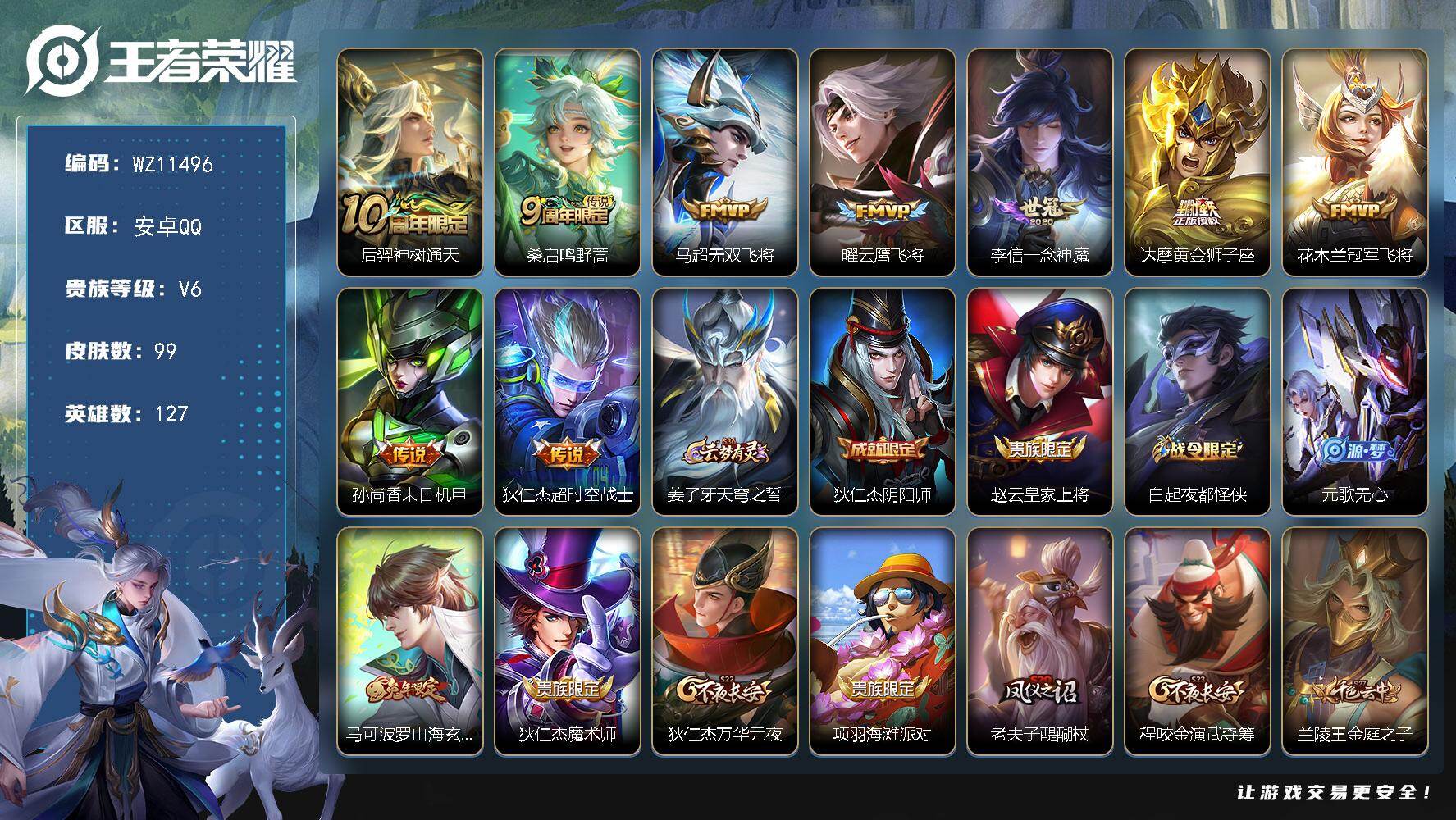 安卓Q-V6-永恒钻石I段位-127英雄-99皮肤-9传说-31史诗【英雄全
