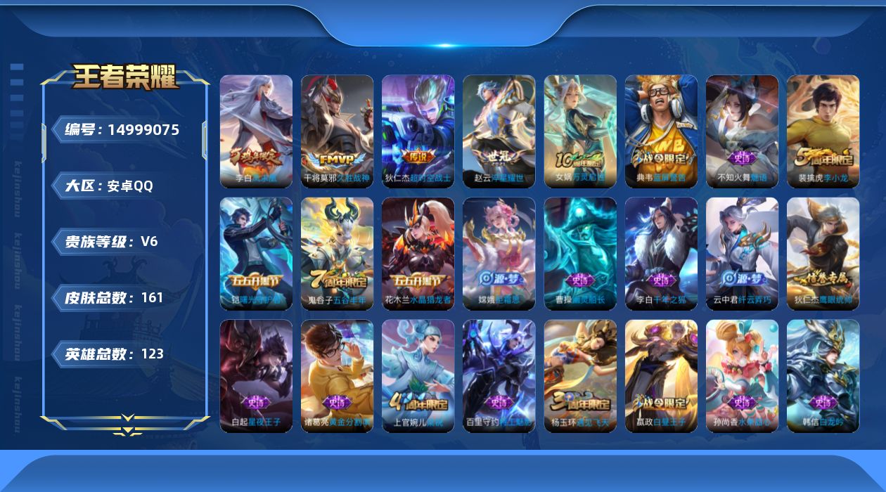 可二次-贵6-72英雄-49皮肤-6传说-10史诗-19限定-8按键