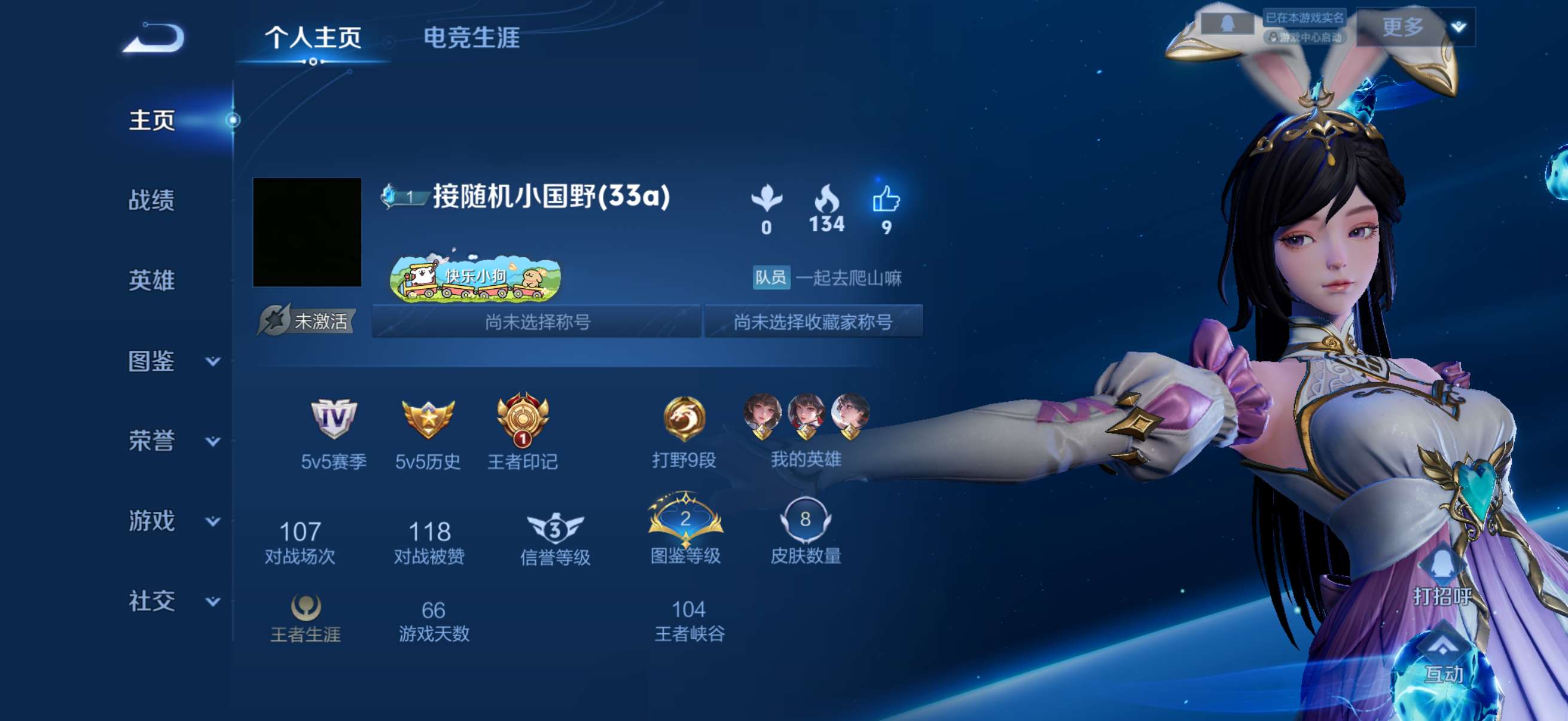 实名: 可修改 贵族等级: V7 英雄数: 110 皮肤数: 107 星传说: