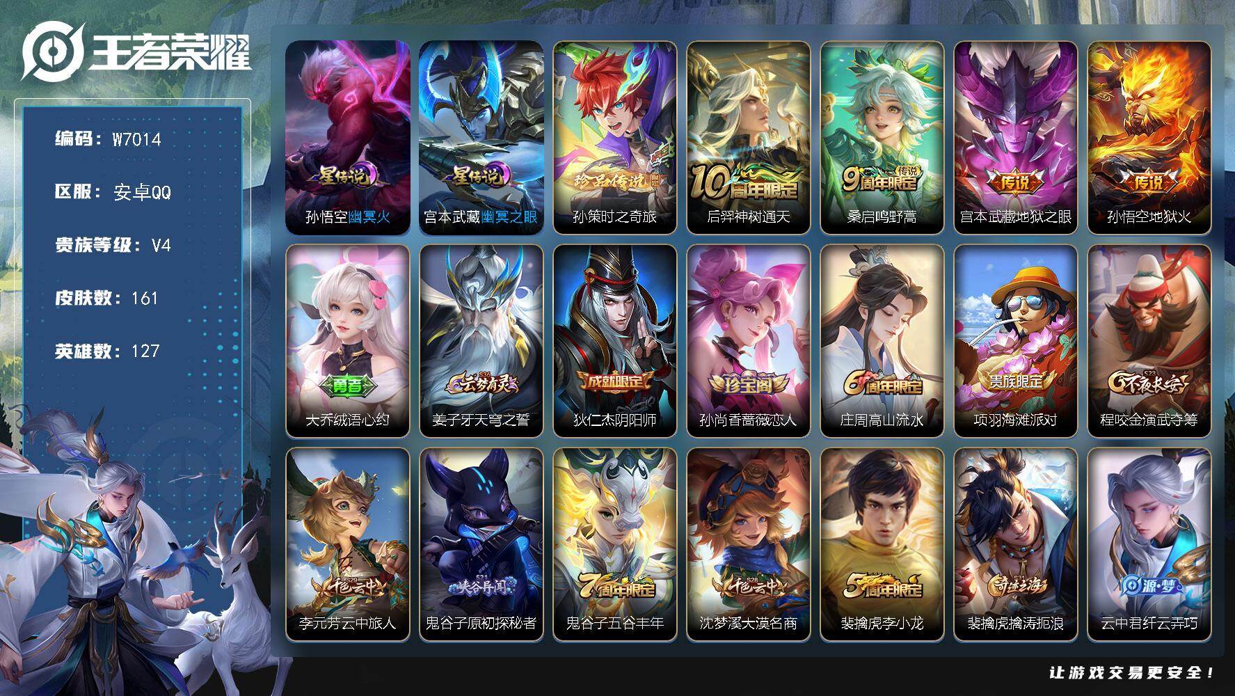 贵4-127英雄-161皮肤-1珍品传说-4传说-2星元-44限定-8按键-灵宝-1印记-4571贵族积分