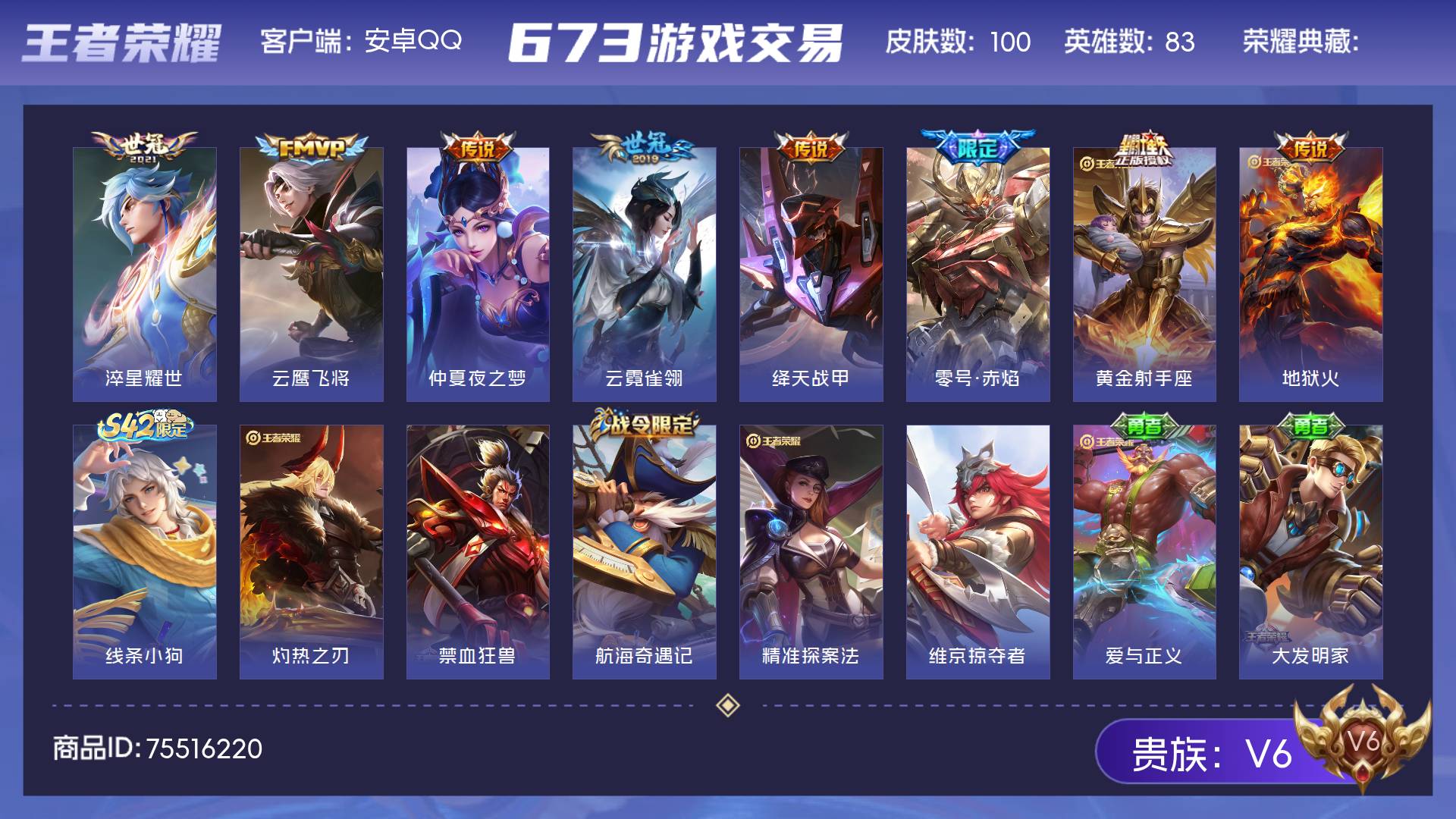 V6 皮肤100 英雄83 荣耀黄金 传说8 其他皮肤97