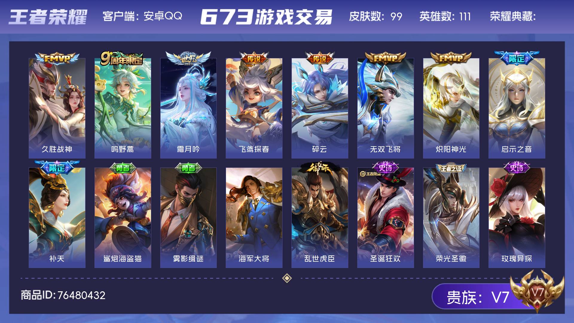 V7 皮肤99 英雄111 至尊星耀 传说9