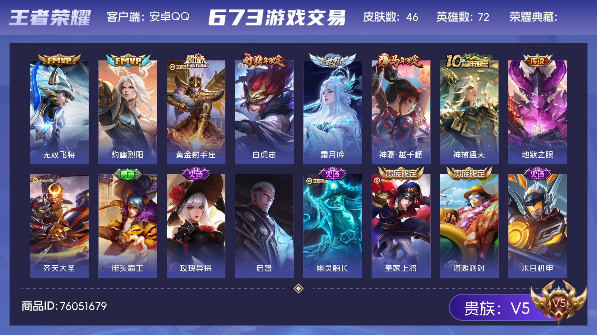 V5 皮肤46 英雄72 至尊星耀 传说9 其他皮肤43
