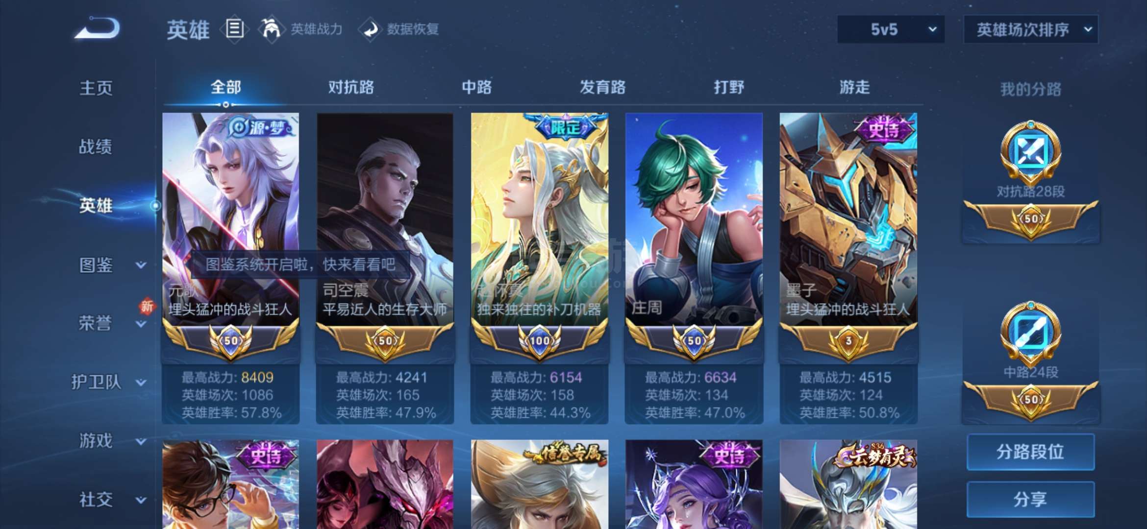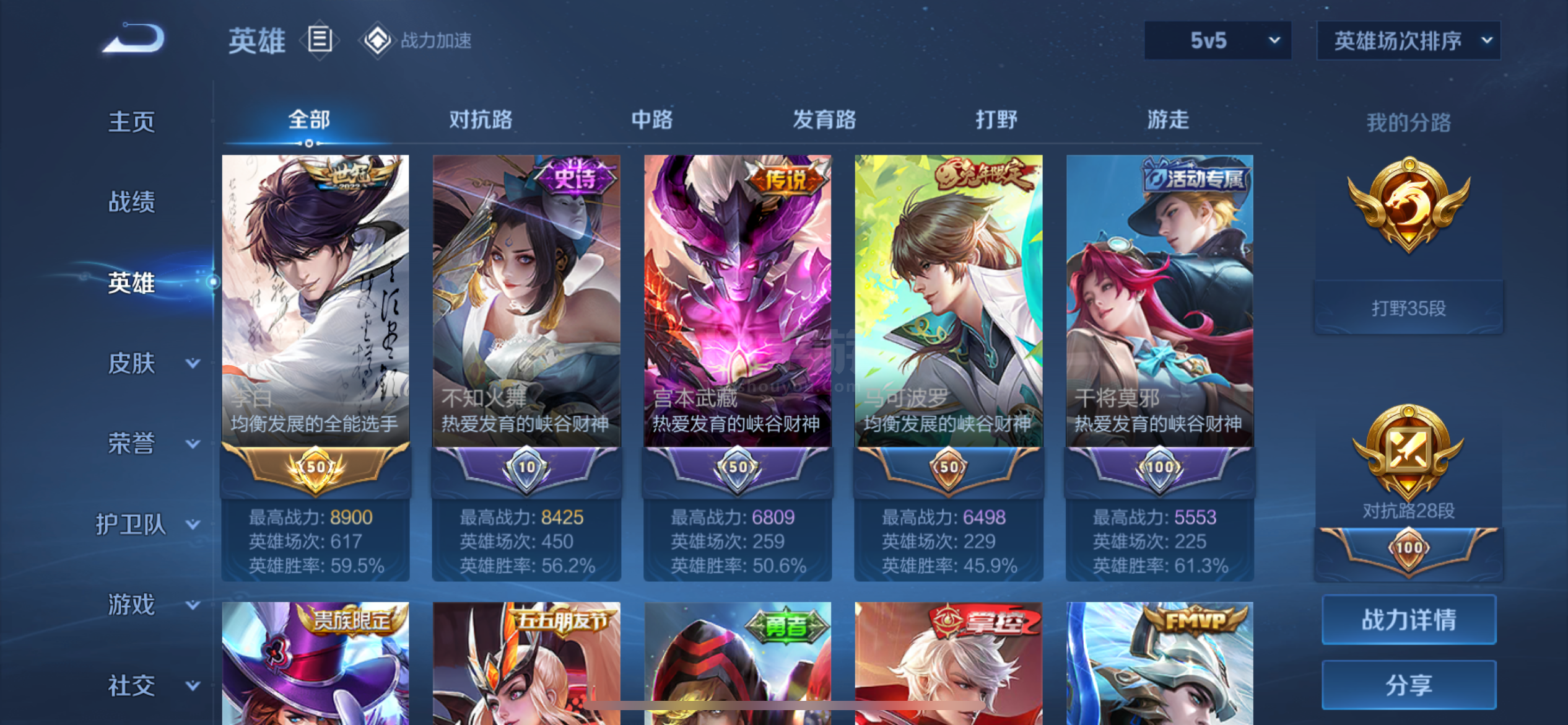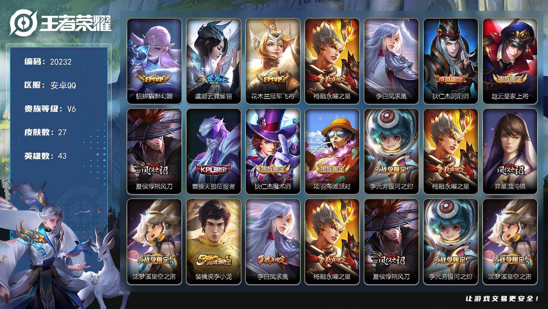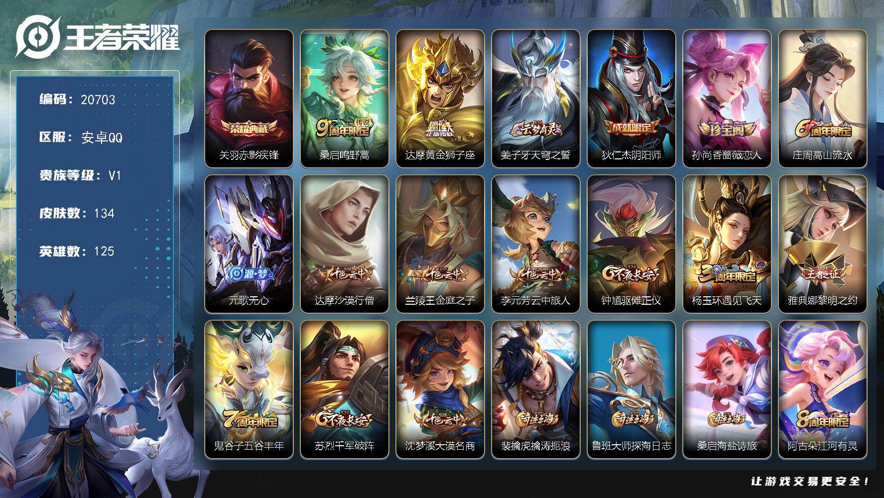 实名: 可修改 贵族等级: V3 英雄数: 125 皮肤数: 79 传说皮: