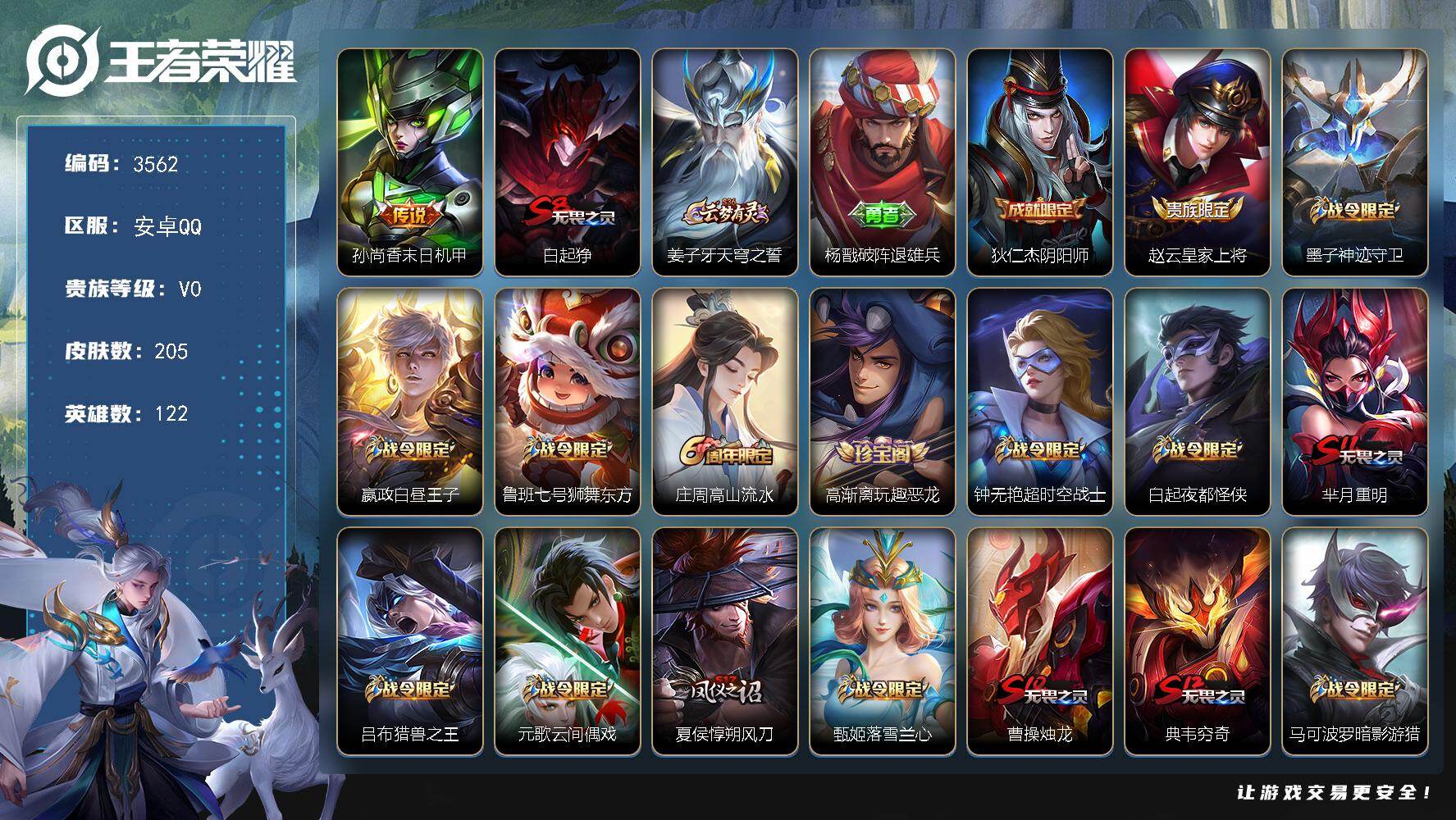 安卓Q-V0-荣耀黄金I段位-122英雄-205皮肤-1传说-48史诗【传说