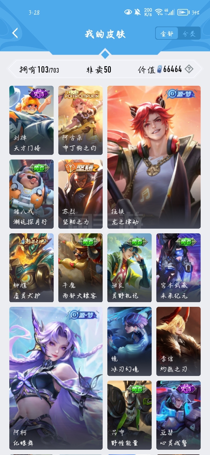 皮肤86 英雄101 尊贵铂金 传说6 其他皮肤36-安卓Q-V0-秩序白银I段位-97英雄-85皮肤-6传说-21史诗【传说皮肤