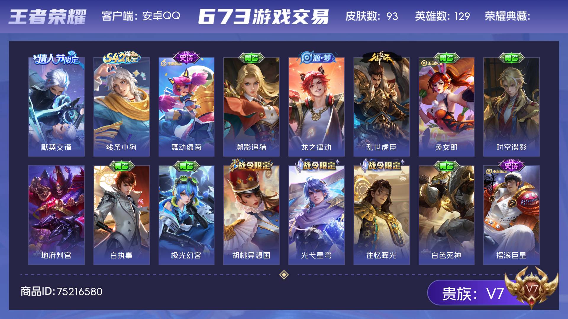 V7 皮肤93 英雄129 至尊星耀 传说1 其他皮肤97