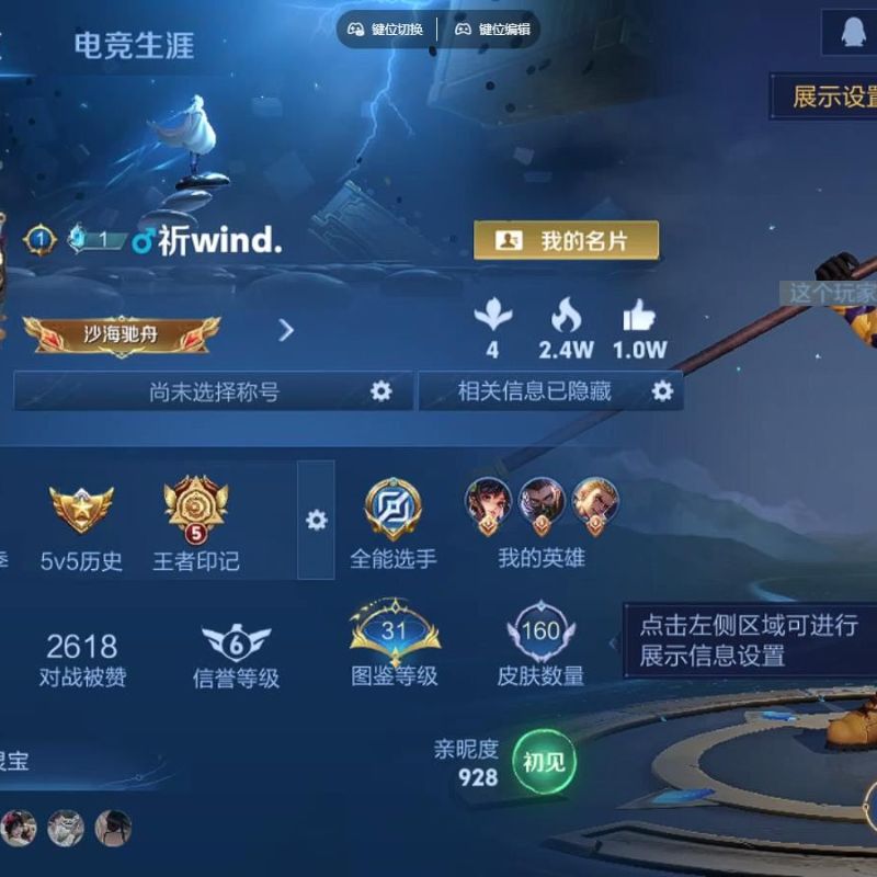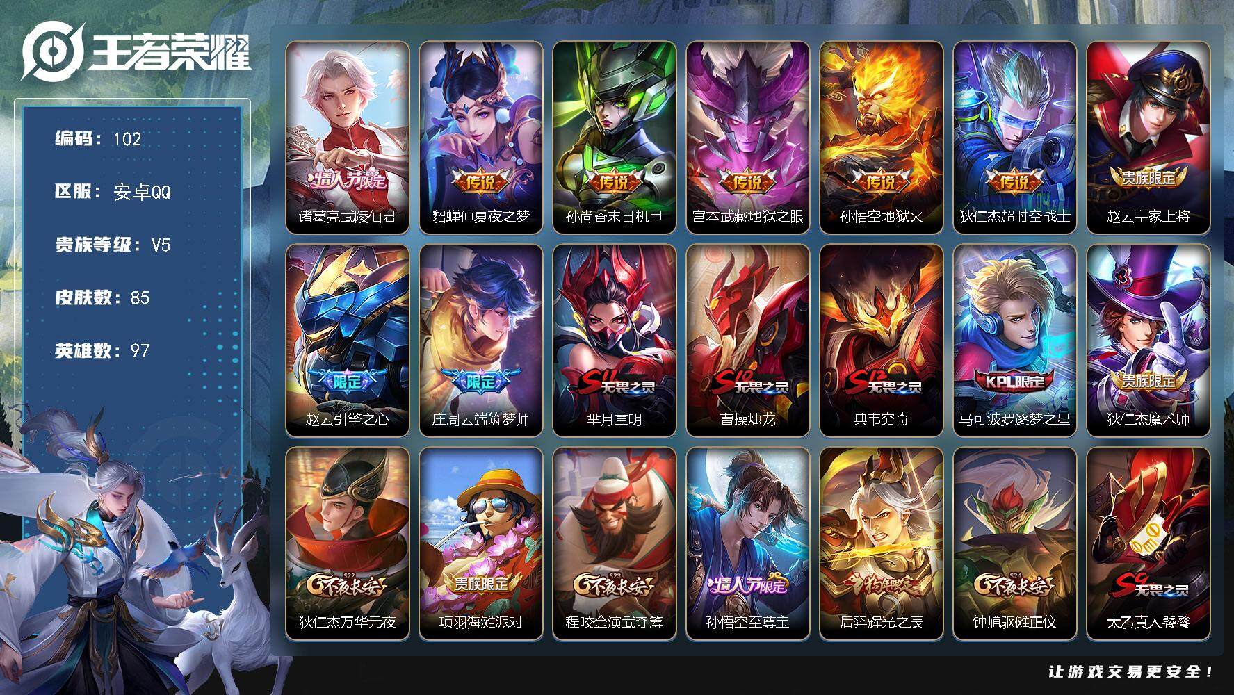 实名: 可修改 贵族等级: V5 英雄数: 102 皮肤数: 70 传说皮: