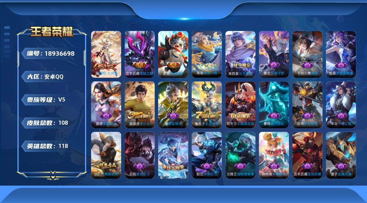 实名: 可修改 贵族等级: V7 英雄数: 129 皮肤数: 162 传说皮:
