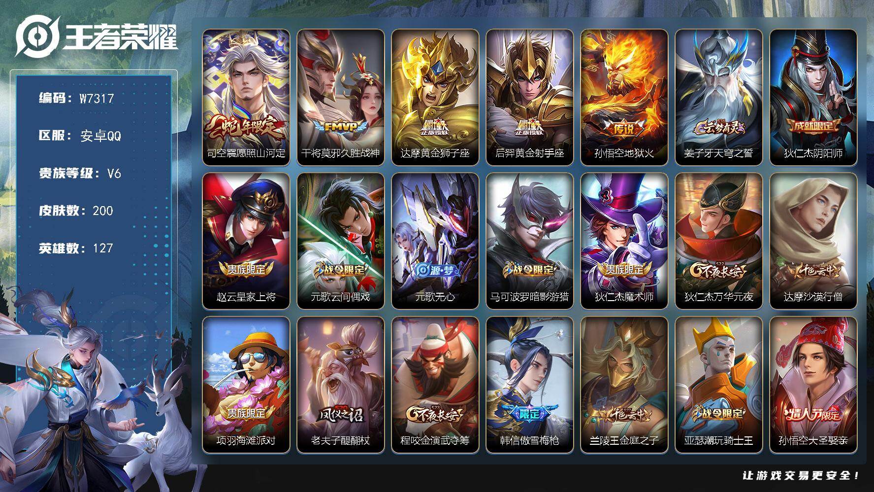 安卓Q-V0-尊贵铂金I段位-127英雄-144皮肤-5传说-36史诗【英雄