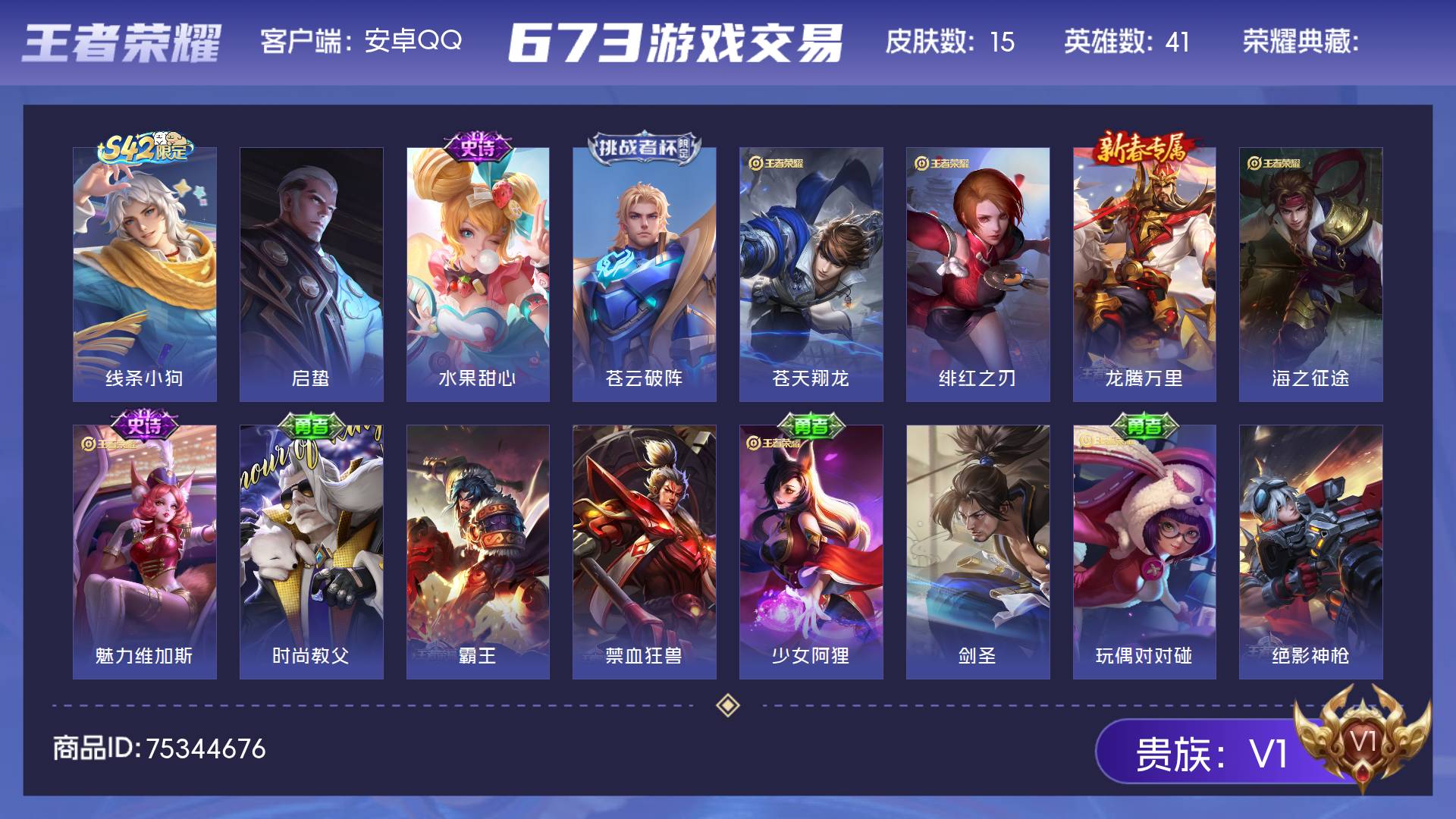 V1 皮肤15 英雄41 尊贵铂金 其他皮肤20