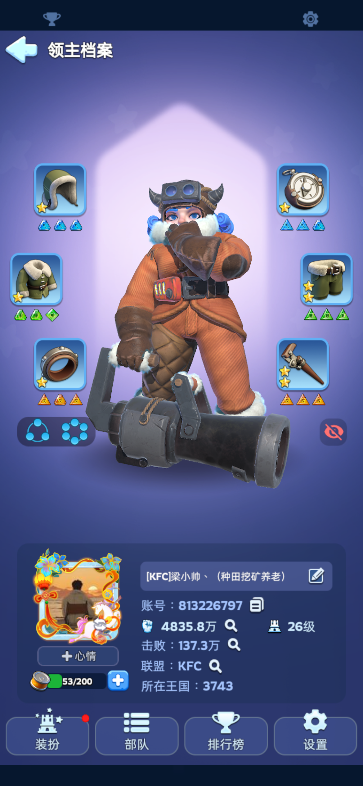 尽冬日账号,统帅10,火8,弓T11,盾8,矛7,,资源多,加速道具全,背包材料丰富,账号安全可解绑